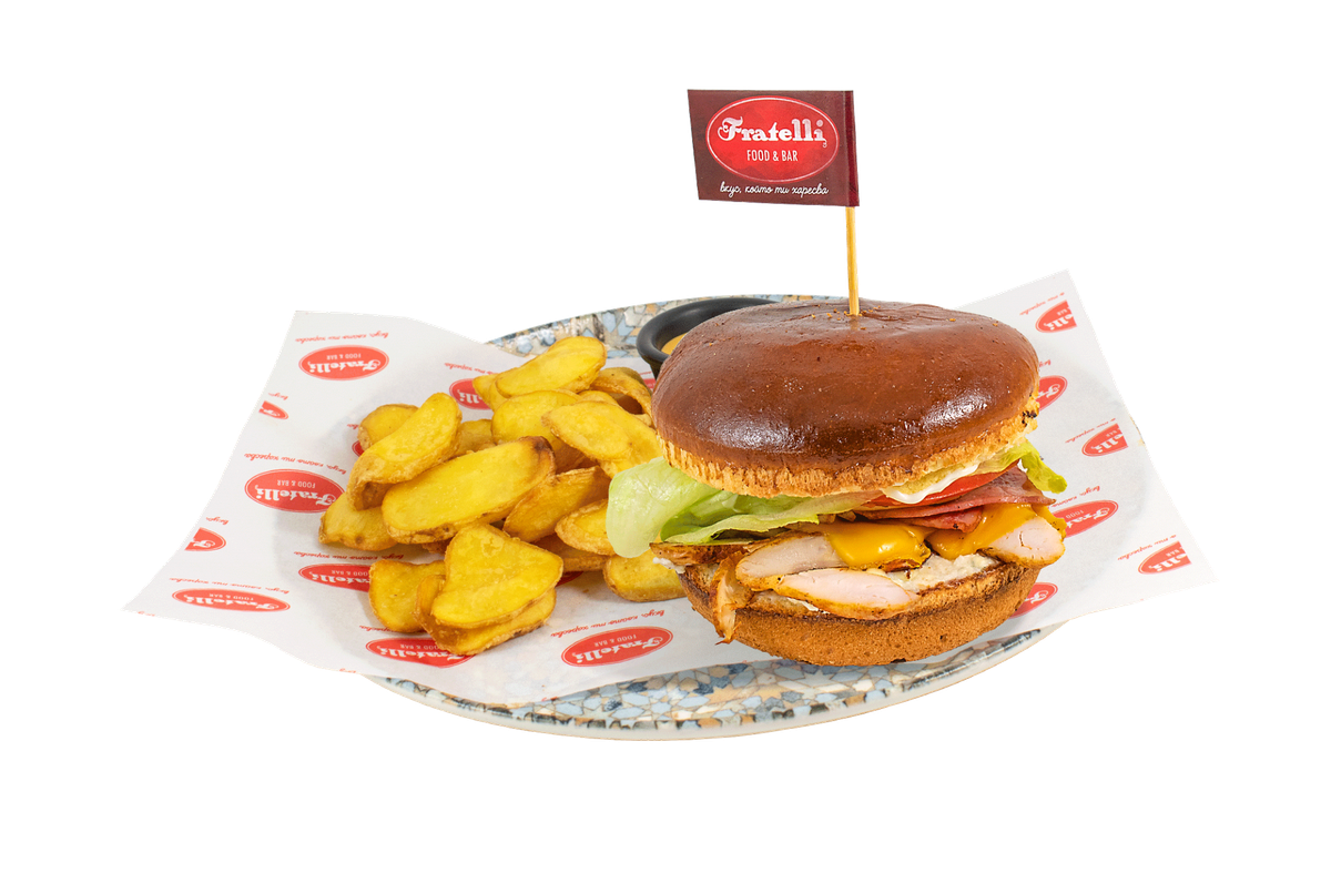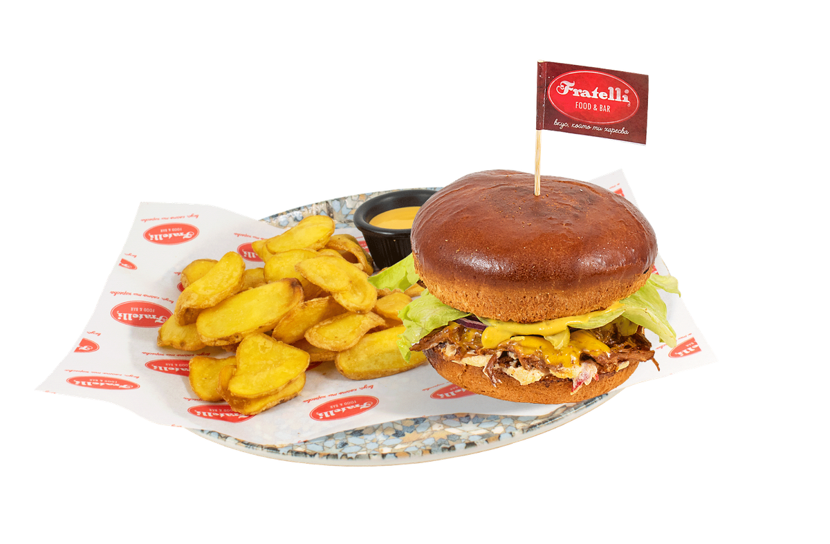 сладко хлебче с разядка от крема сирене и печен пипер, телешко месце, айсберг, кисела краставичка, червен лук, Чедър сирене, горчица и майонеза, поднесен с френски картофки и бургер сос 400г