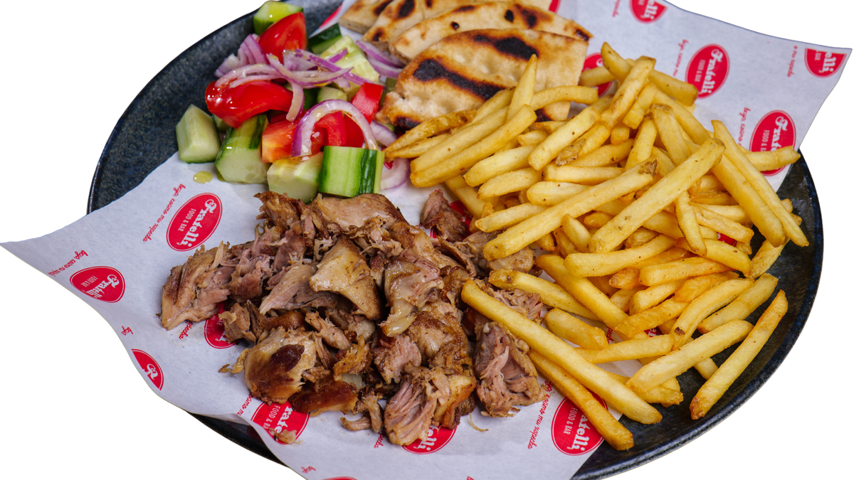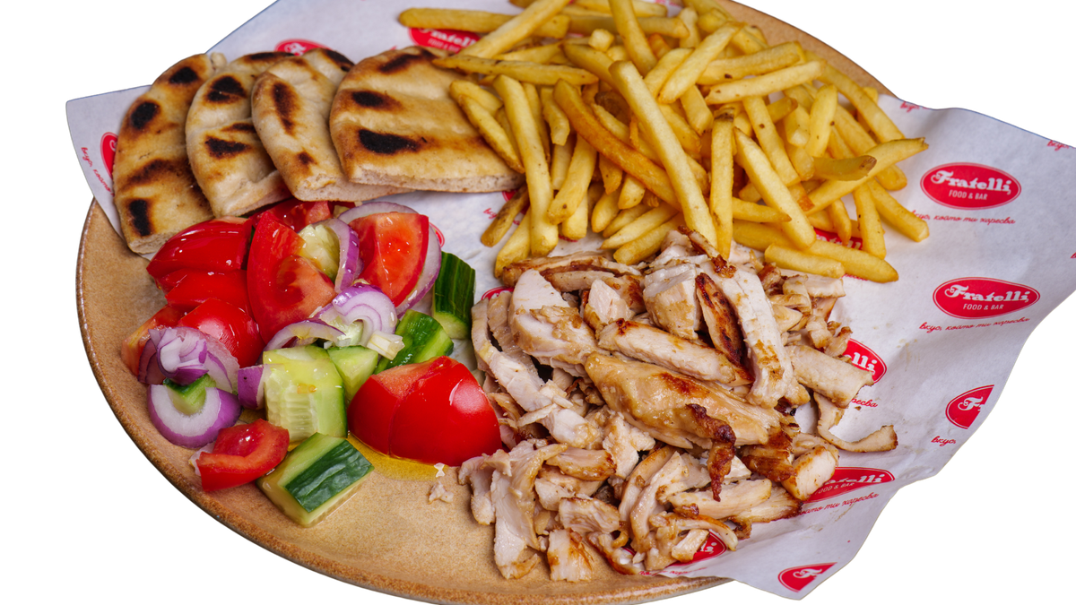 запечено пилешко месце, поднесено с гръцка питка, домати, краставици, червен лук, пържени картофки и чеснов сос 500г