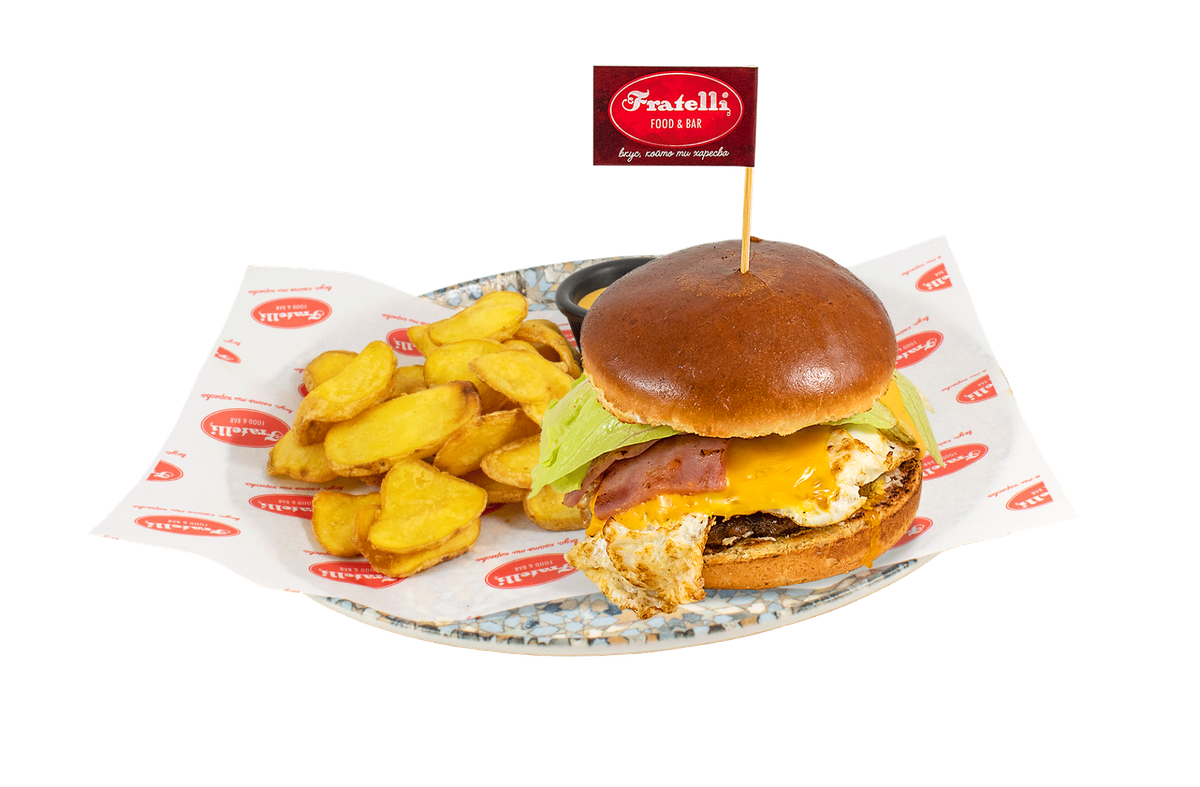 сладко хлебче, намазано с разядка от сирена и сусам, с кълцано телешко Блек Ангъс, двойно Чедър сирене, бекон и яйце приготвени на плоча, домат, кисели краставички, айсберг поднесен с френски картофки и бургер сос 400г