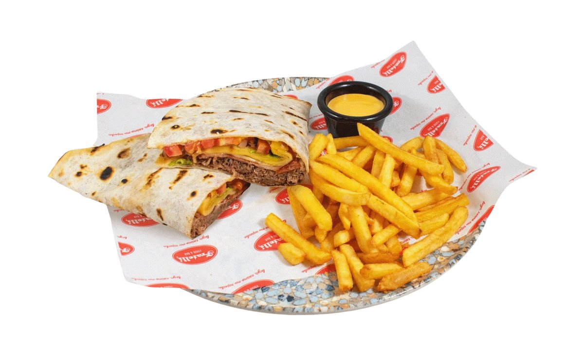 арабска питка с пилешко бон филе, бекон, двоен чедър, айсберг, домат, червен лук, барбекю сос, бургер сос, поднесен с пържени картофки
