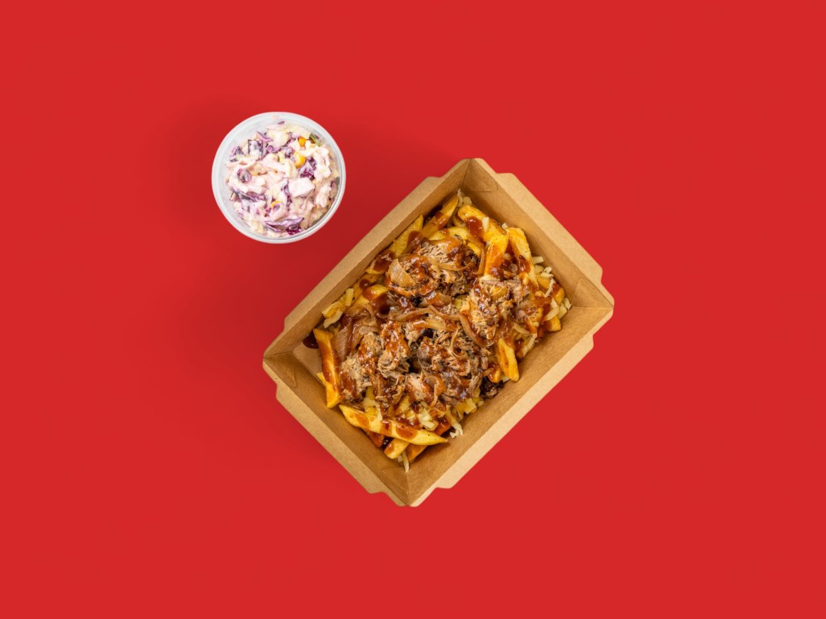 дърпано свинско месце, шарено зеле, микс сирена, барбекю сос, майонеза, кисели краставички, пържени картофки 350г