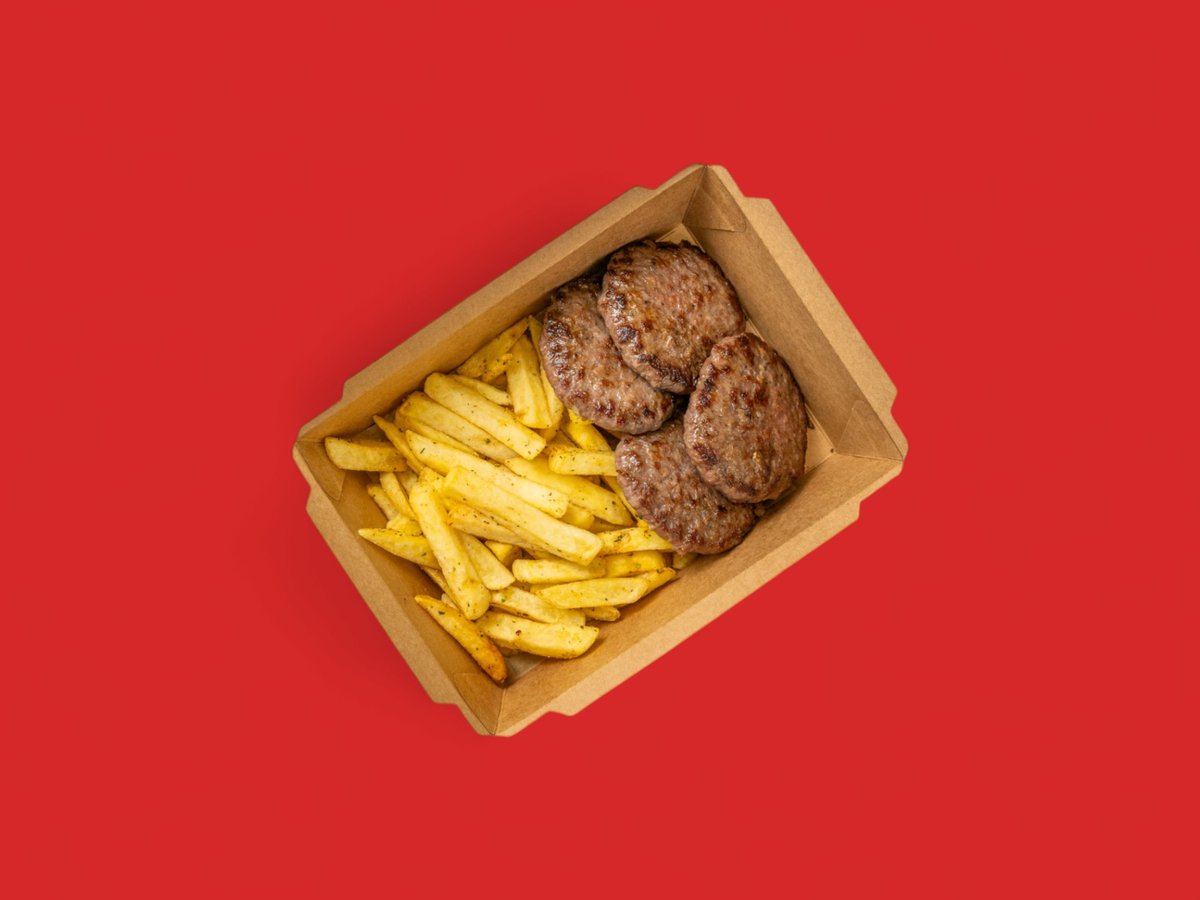 3 броя свински кюфтета 80г, картофки, шарено зеле, кисела краставичка, медена горчица, картофките може да замените с ароматен ориз 550г