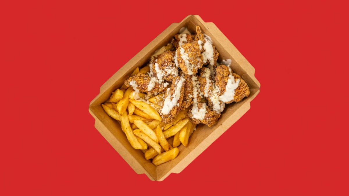 хрупкави пилешки хапки, картофки, шарено зеле, кисела краставичка, айоли с Пармезан, картофките може да замените с ароматен ориз 550г