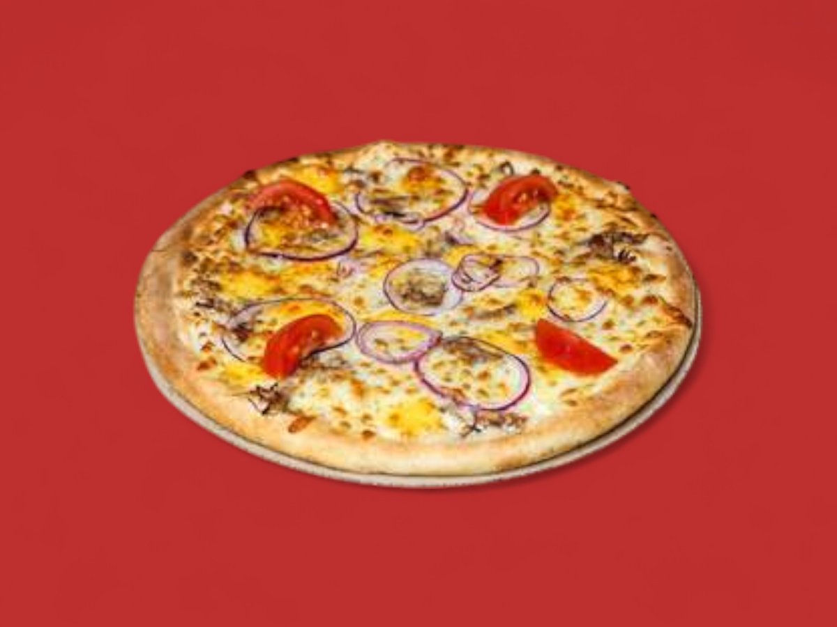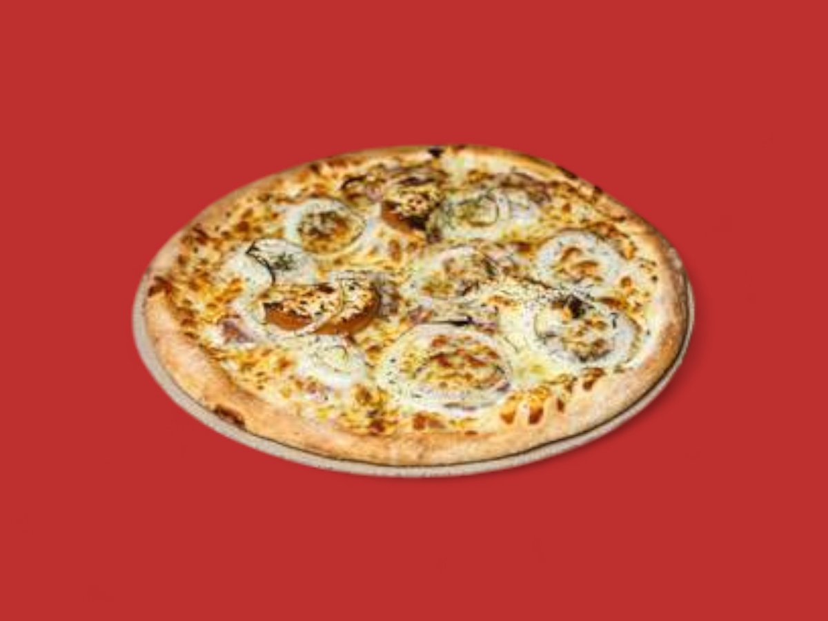 пица сос, бекон, карамелизиран лук, барбекю сос, моцарела 50см