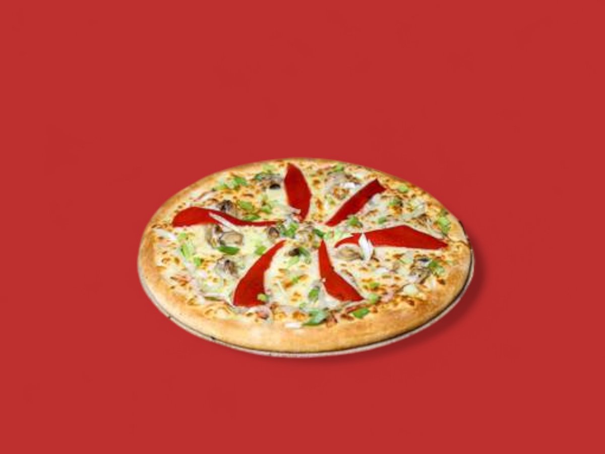 чеснов сос бекон мариновани гъби моцарела печен пипер зелен лук 50см