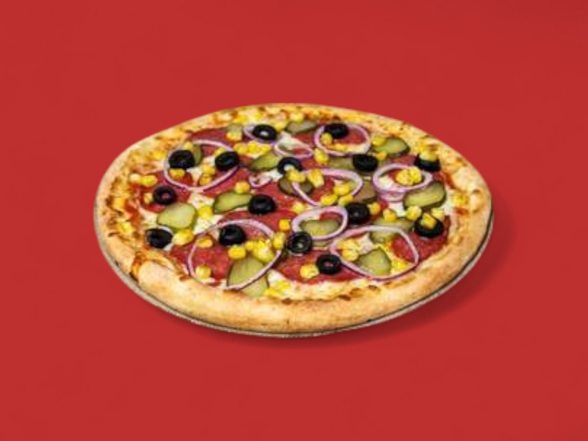 пица сос луканков колбас, шунка, кис краставици, лук, маслинн, царевица, моцарела