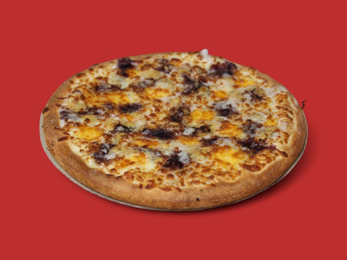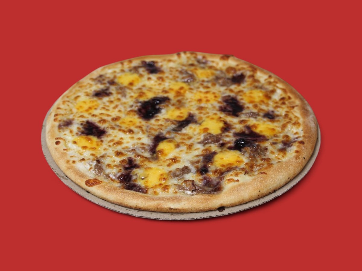 пица сос, бекон, карамелизиран лук, барбекю сос, моцарела