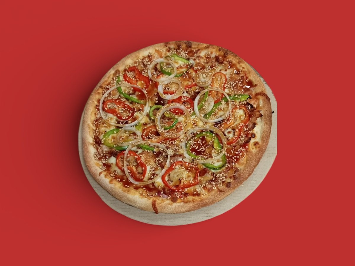 доматен сос, пилешко филе, моцарела, червен пипер, зелен пипер, сос териаки, бял лук, сусам