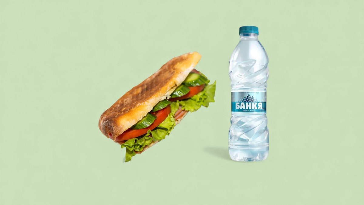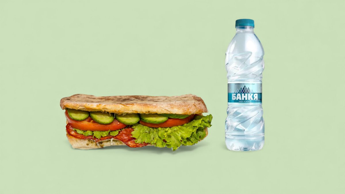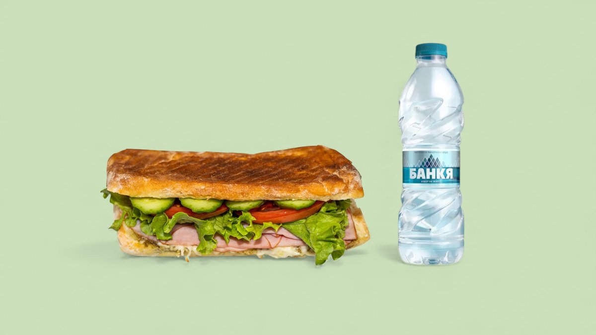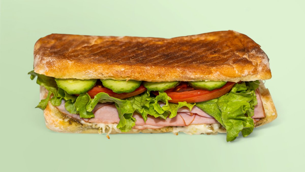 пшенична чабата, маслинова паста, песто, кашкавал, свинска шунка, салата айсберг, домат, краставица, сос по избор 320г