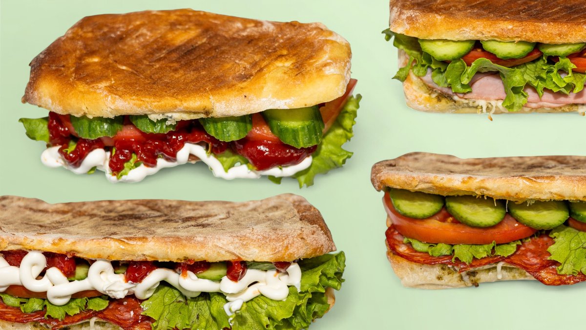 чабата, кашкавал, пеперони, песто, маслинова паста, зеленчуци, сос по избор