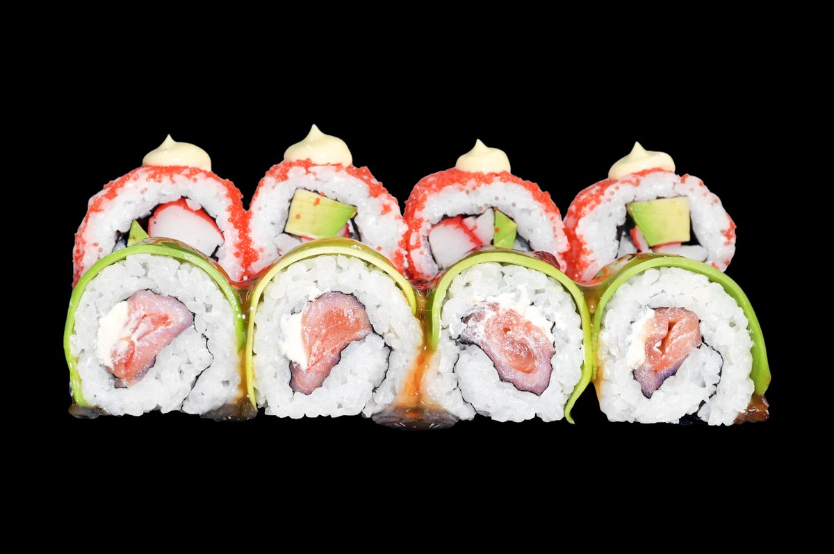 ориз, нори, Филаделфия, пушена сьомга, авокадо и дракон сос 8 броя - 240г