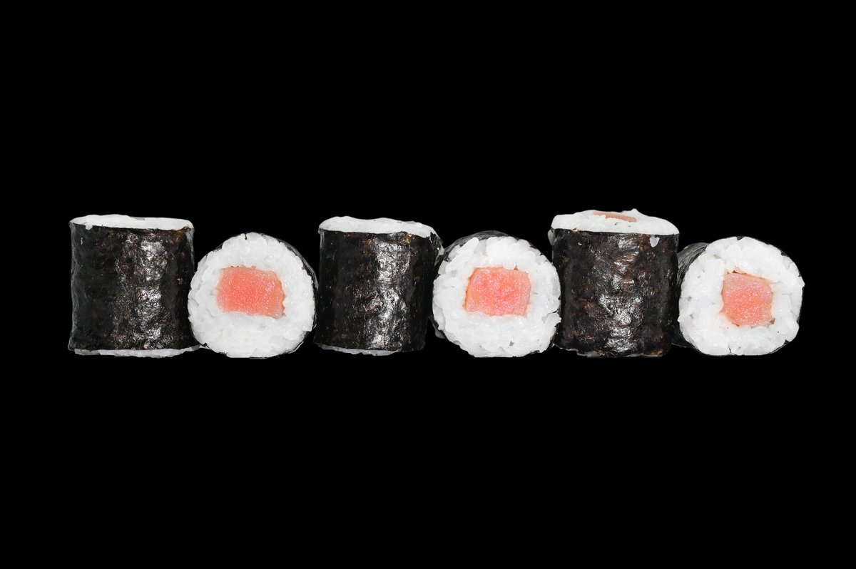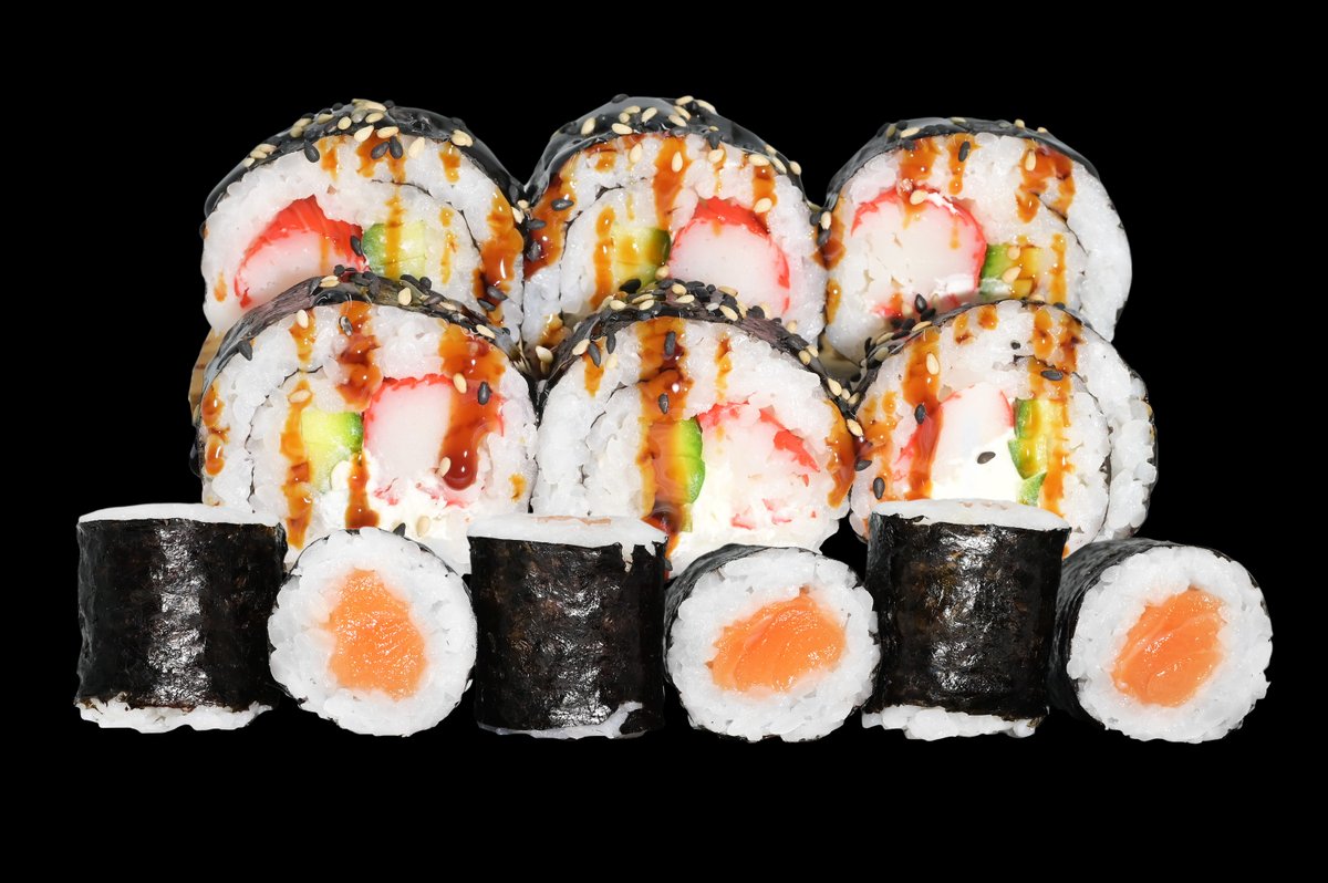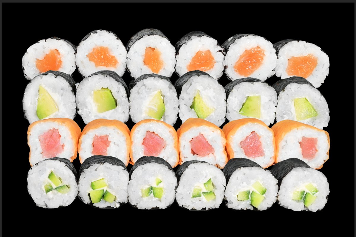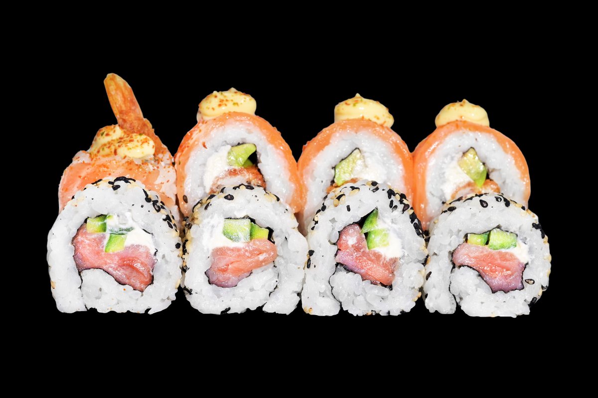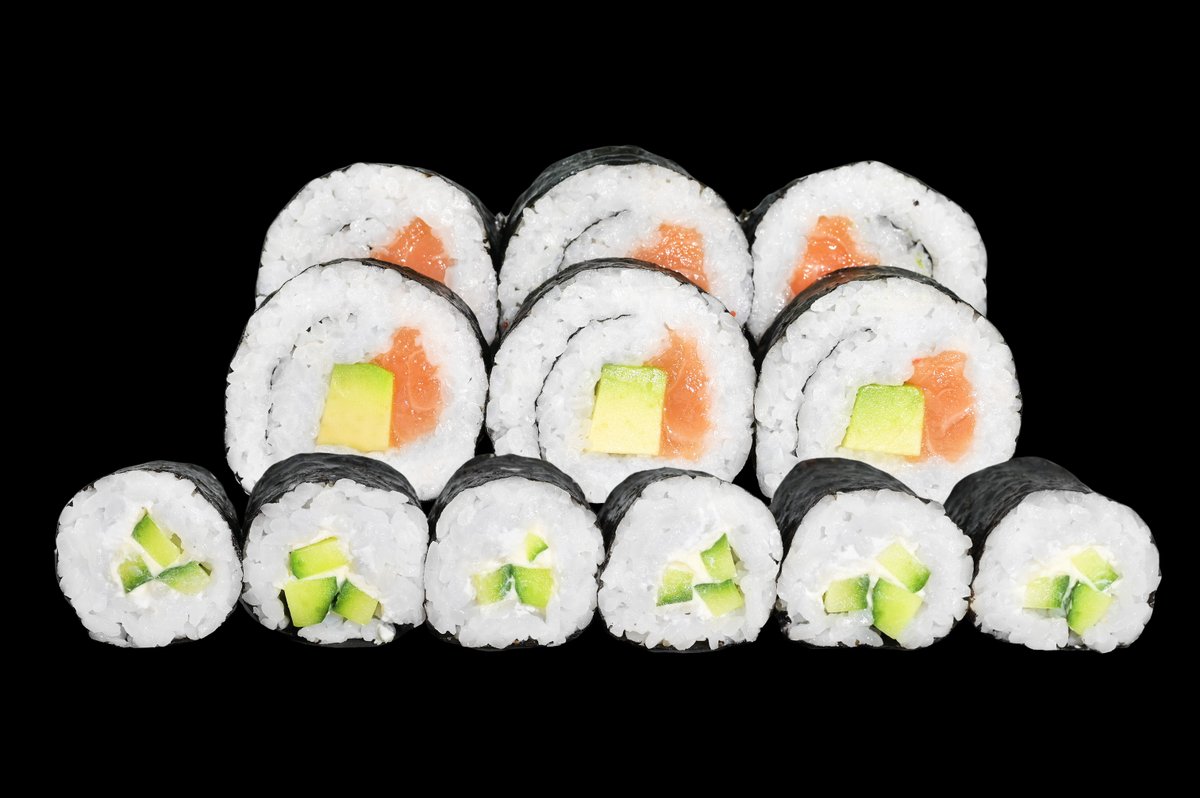 Хосомаки сьомга 8 броя, Хосомаки краставца и авокадо 8 броя, Хосомаки тон 8 броя, Хосомаки авокадо и филаделфия 8 броя, Урамаки вулкан 8 броя, Урамаки невада 8 броя, Урамаки филаделфия 8 броя 56 хапки - 1200г