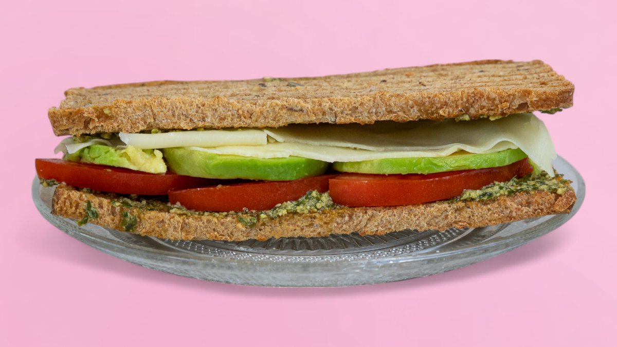 пълнозърнест хляб с жив квас, домашно босилеково песто, домат, моцарела, авокадо