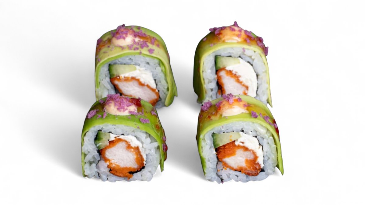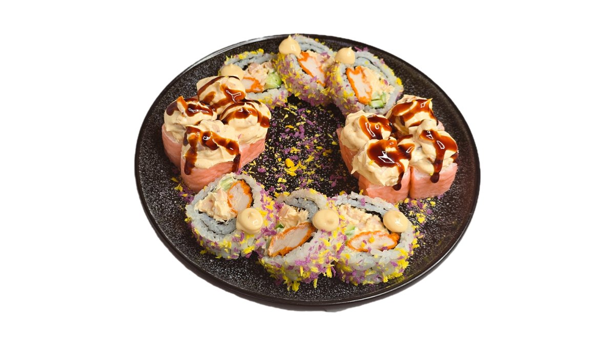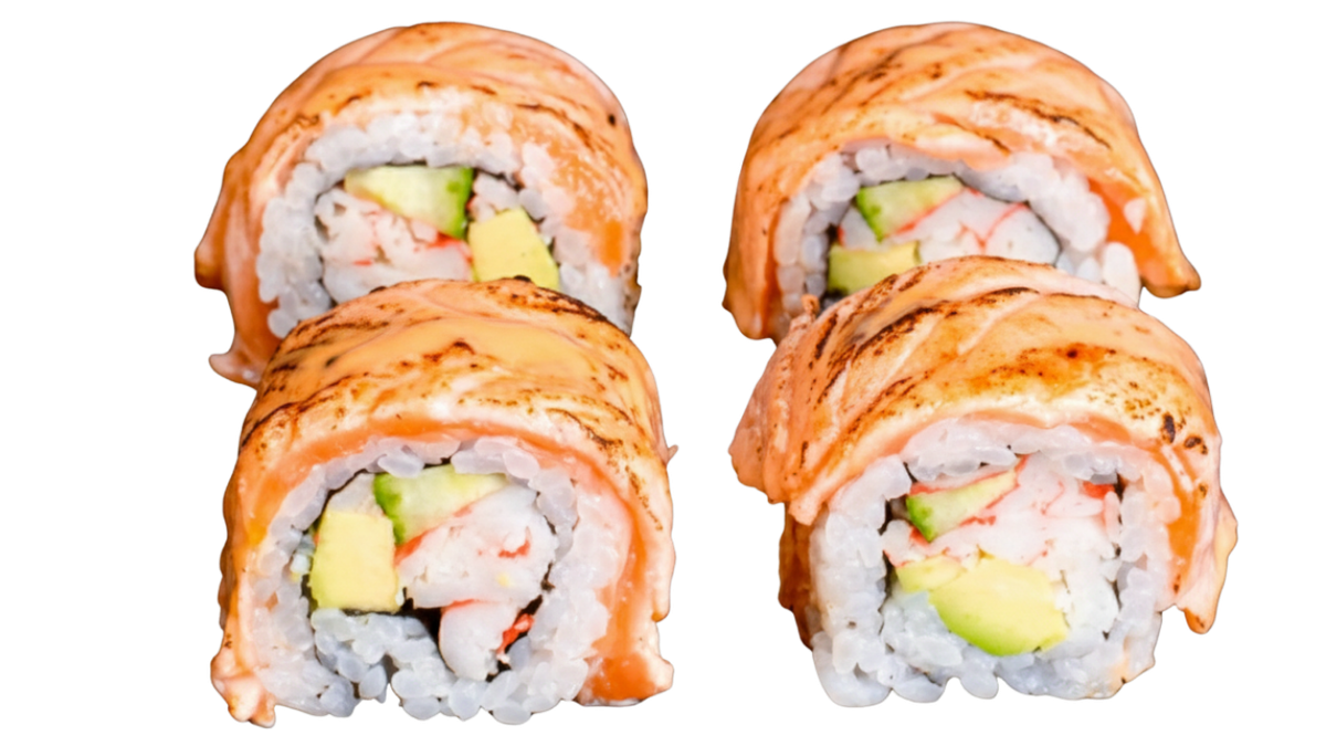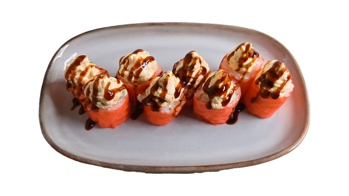 ориз, нори, авокадо, краставица, месо от рак, сурова сьомга (запечена), терияки сос, чили майонеза, черен хайвер 4 бр, 120г