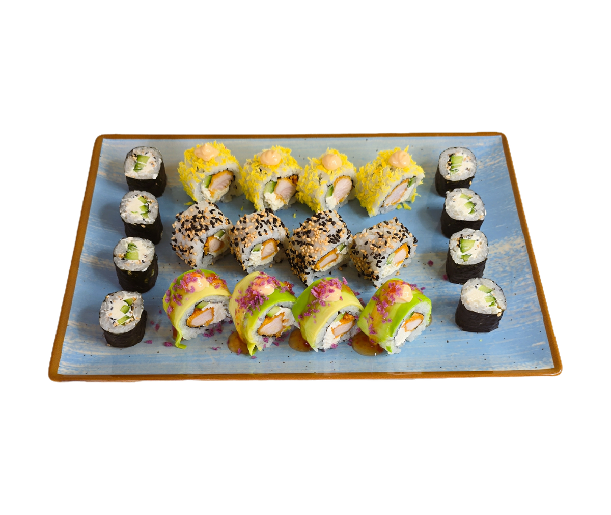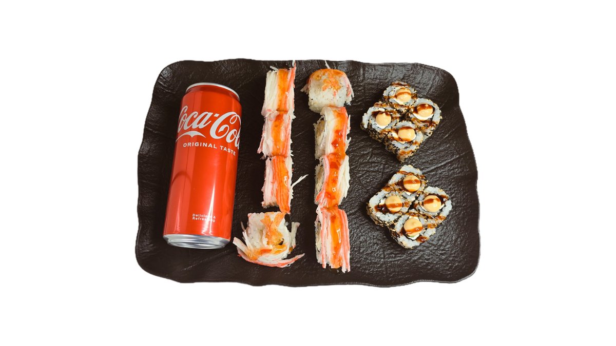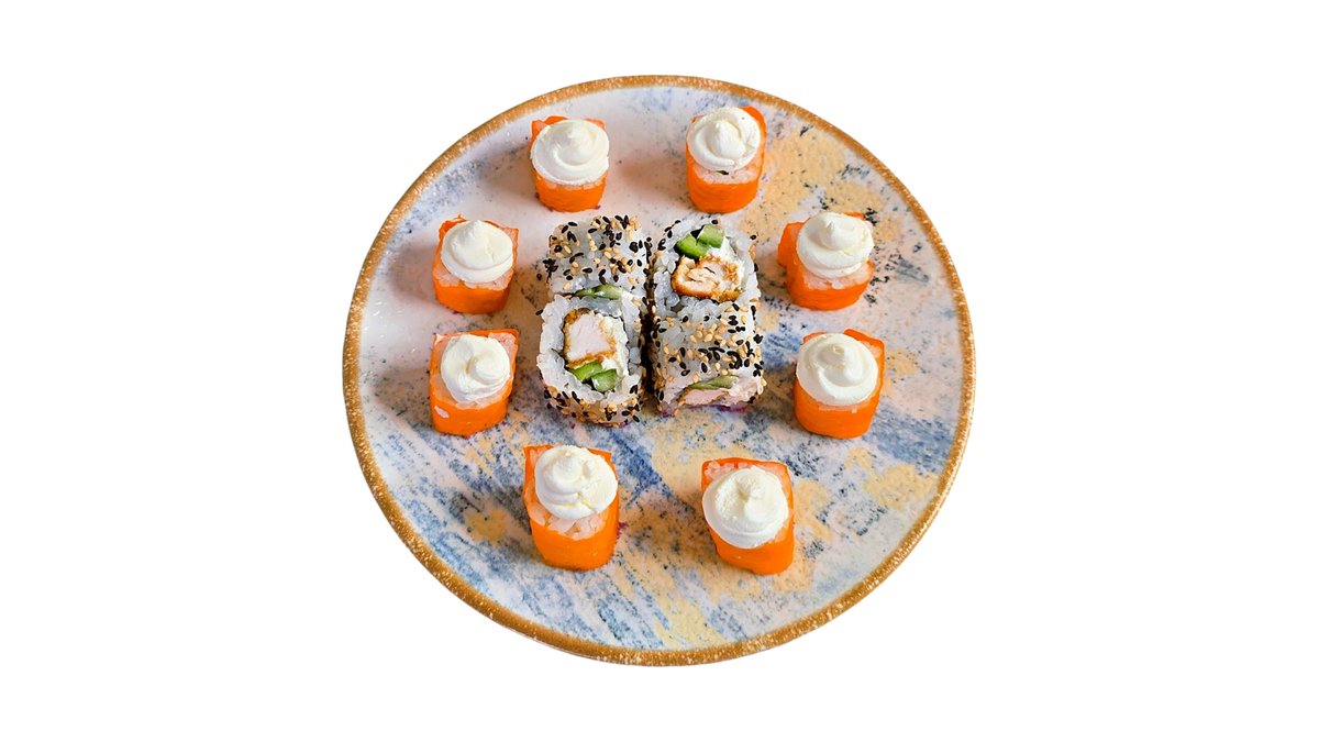 урамаки пушена сьомга и темпура 4 бр урамаки пушена сьомга 4 бр хосомаки краставица и сусам 8 6р общо 16 бр 300г напитка по избор