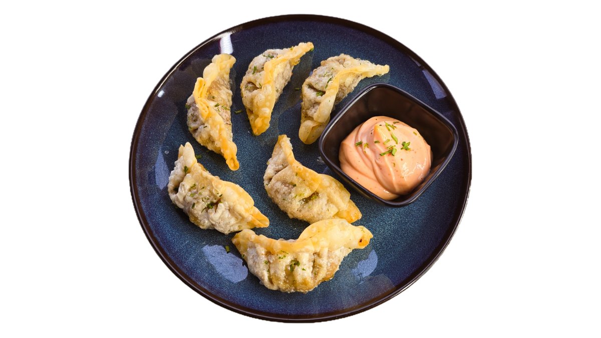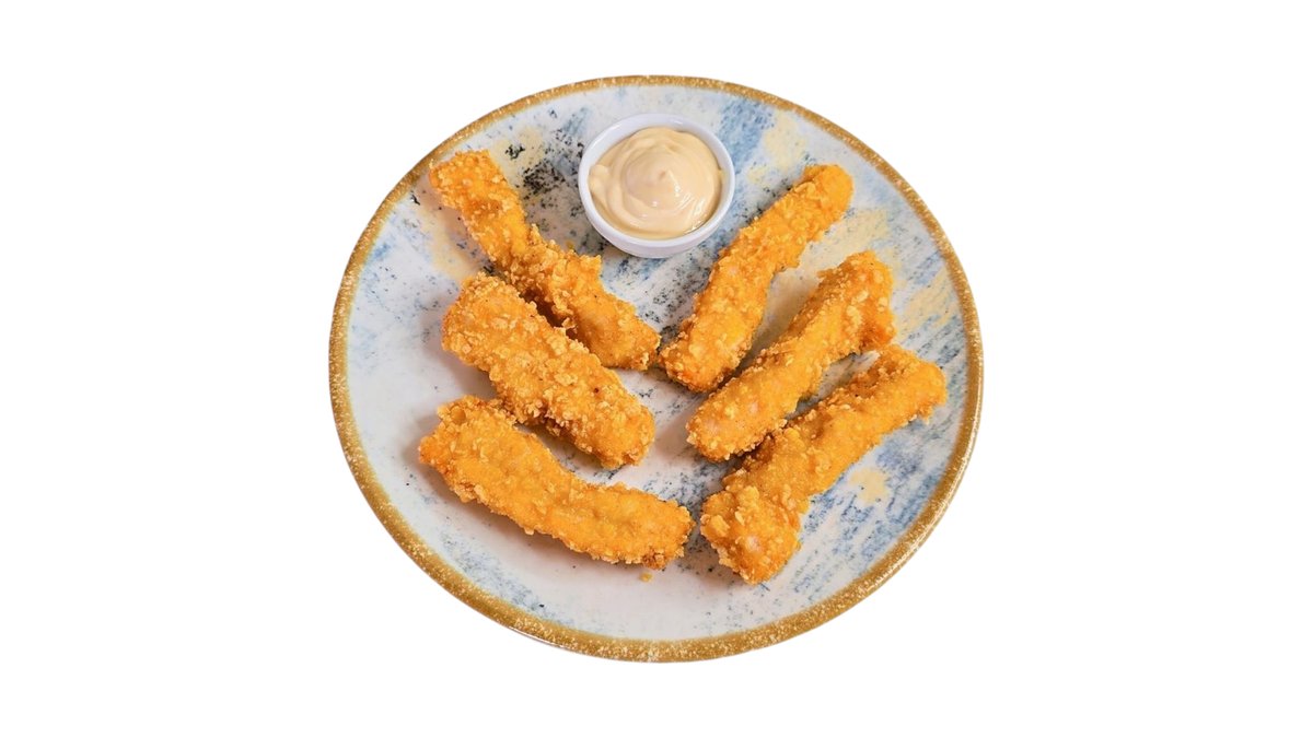 Криспи стрипс, суши оирз, азиатска салата (моркови, уакаме, краставици, азиатски дресинг); гьоза, ширирача майонеза.