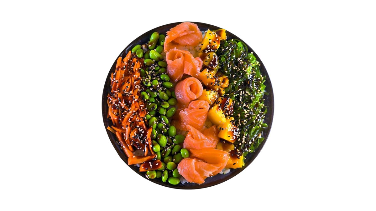 ориз, моркови, уакаме, манго, запечена сьомга, умами, майонеза, едамаме, зърна сусам, унаги сос 400г