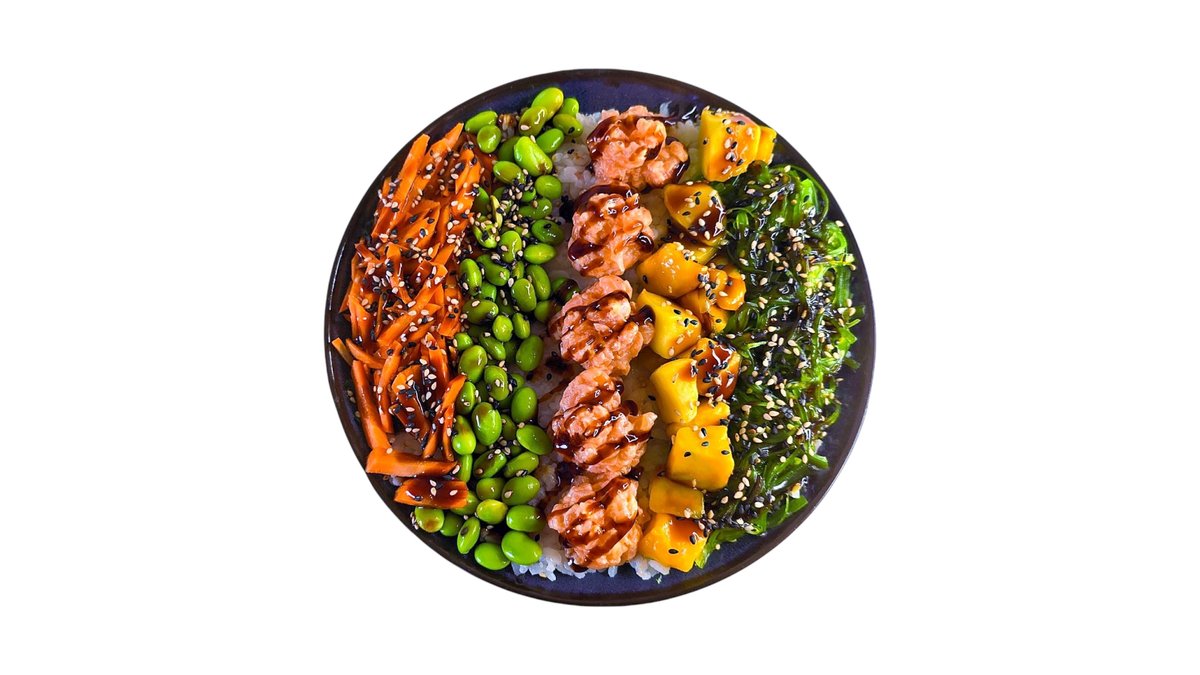 ориз, морков, уакаме, манго, умами майонеза, пилешко филе, терияки сос, едамаме зърна, сусам, унаги сос 400г