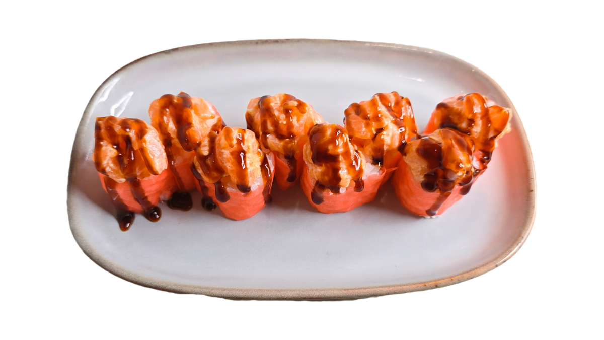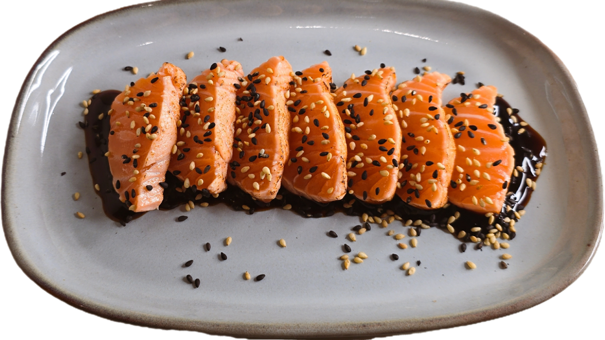 Сьомга татаки , суши оирз, азиатска салата (моркови, уакаме, краставици, азиатски дресинг); гьоза, ширирача майонеза.