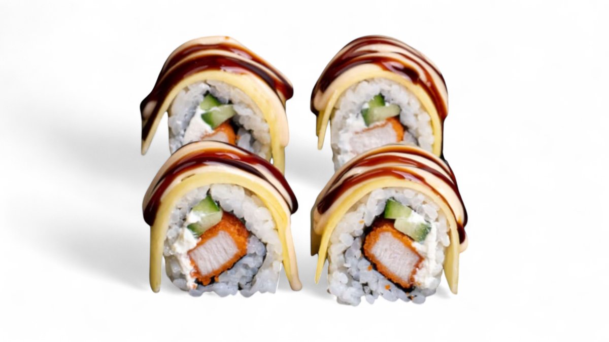 ориз нори пилешка пръчка филаделфия, манго, краставица, японска майонеза унаги сос 4 бр, 100г