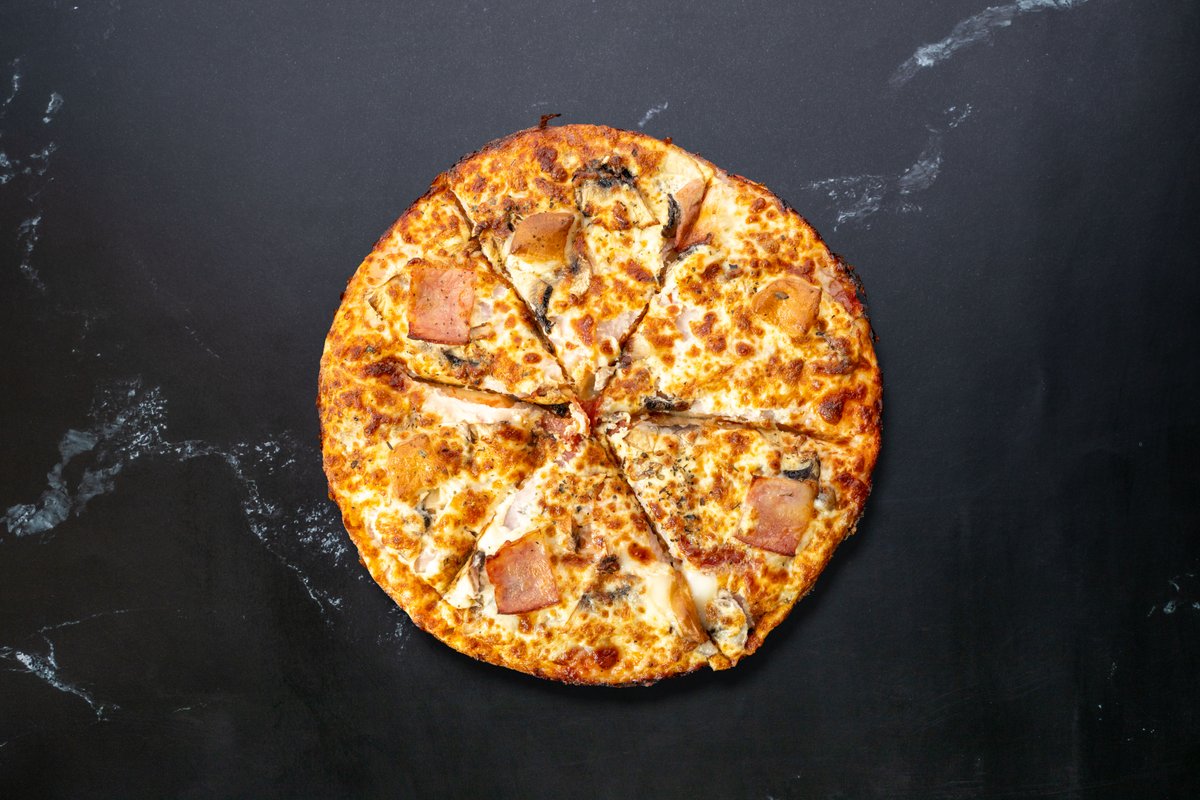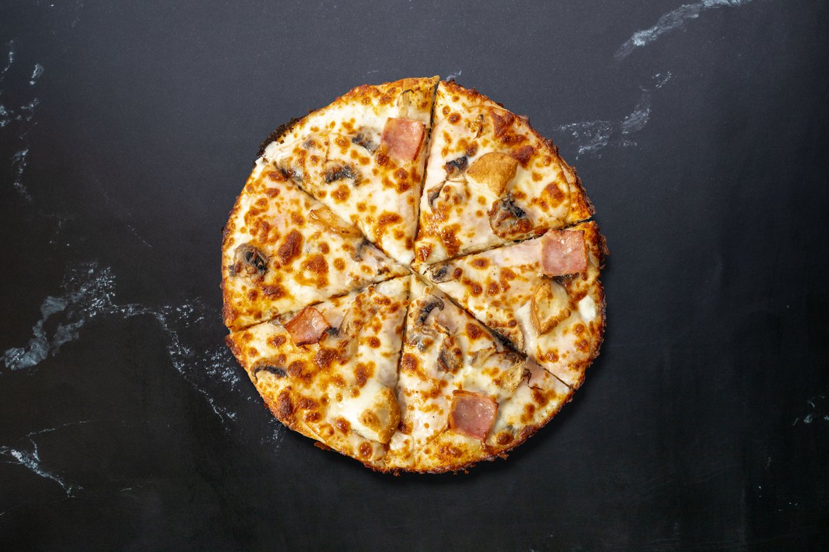 сметана, пилешко филе, гъби, кашкавал, бекон, топено сирене 24см