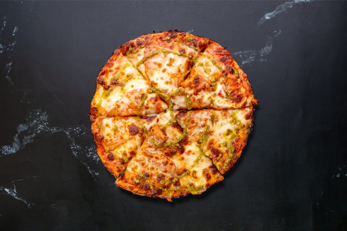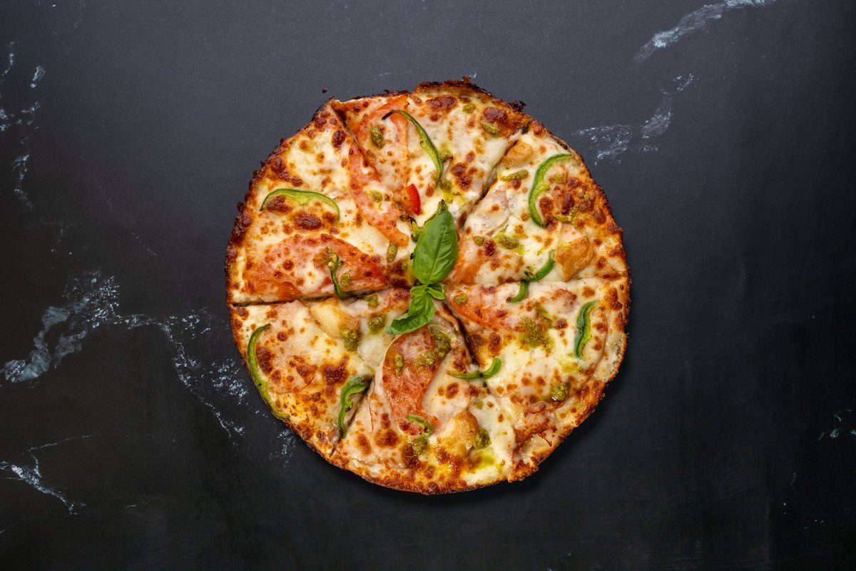 сметана, пушено пилешко филе, домати, кашкавал, пресен пипер, топено сирене, моцарела, сос песто 24см