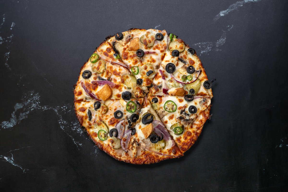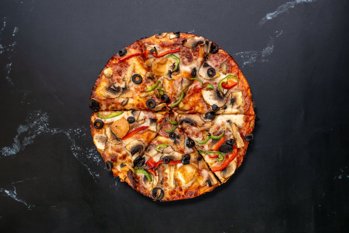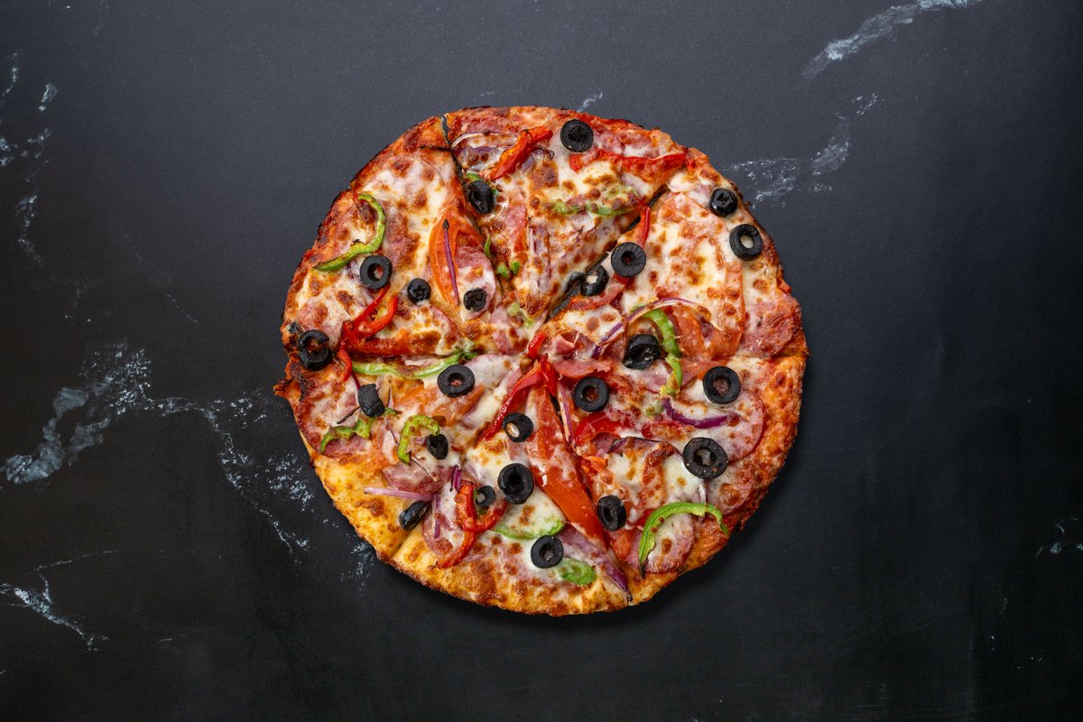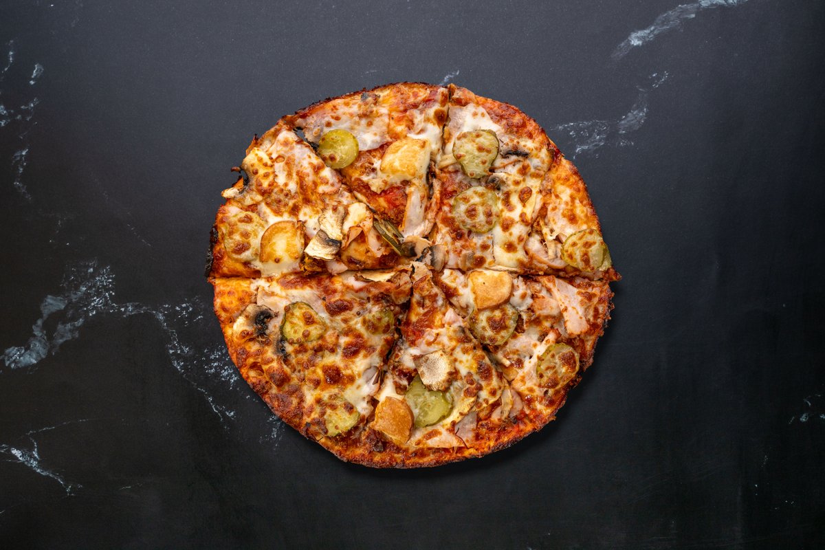 доматен сос, луканка, бекон, кашкавал, гъби, топено сирене, пресен пипер, кисели краставички и маслини 24см