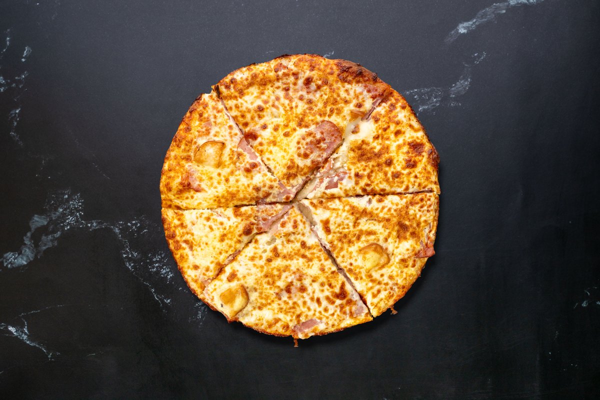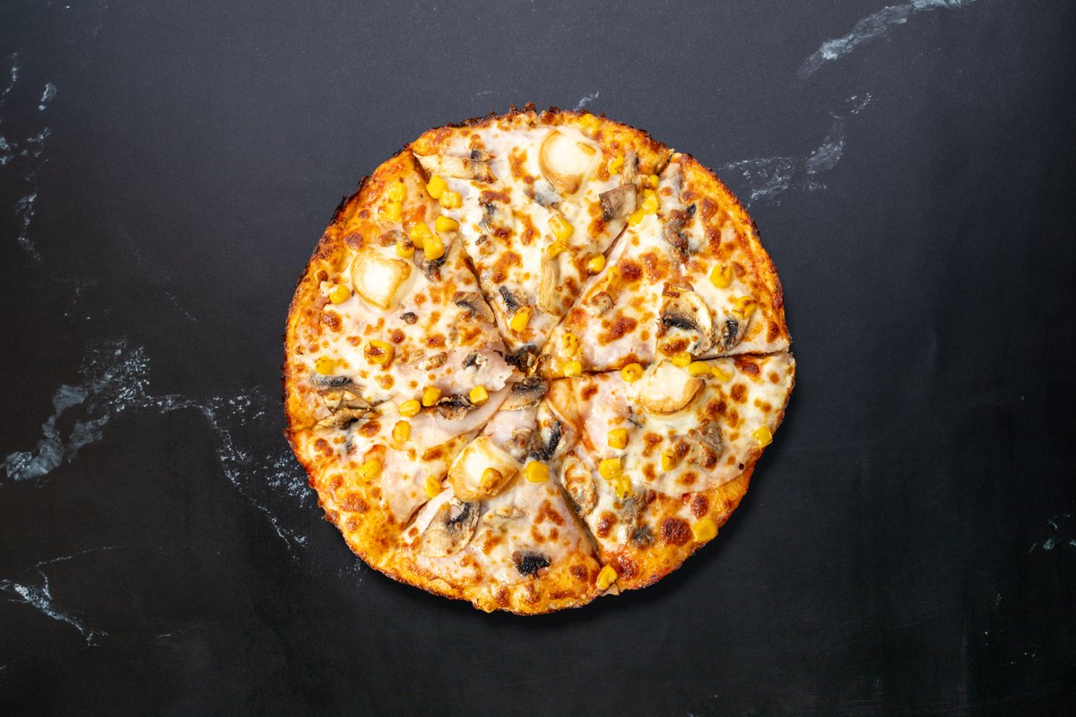 доматен сос, пилешко филе, пресни гъби, кашкавал, млечна царевица, топено сирене 24см
