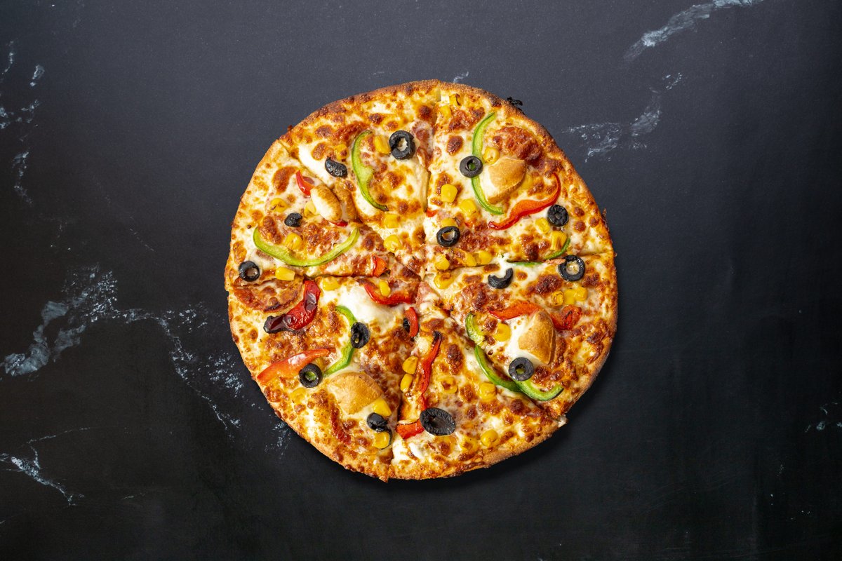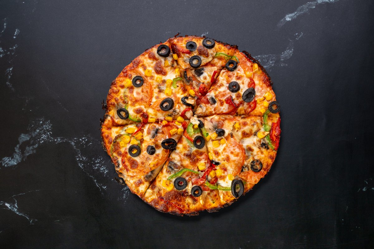 доматен сос, кашкавал гъби, пресен, пипер, маслини, царевица, доматки 24см