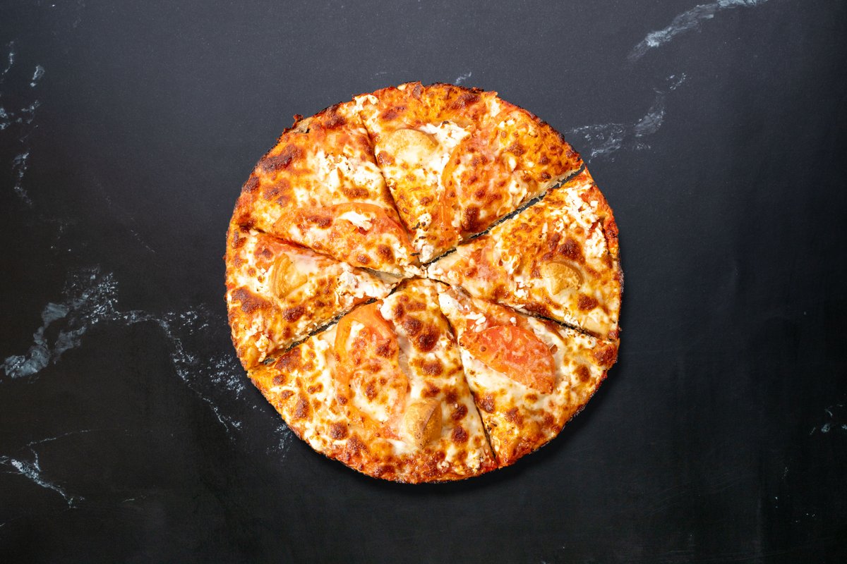 чеснова паста, пилешко филе, пресни гъби, кашкавал, топено сирене, червен лук, люти чушки 24см