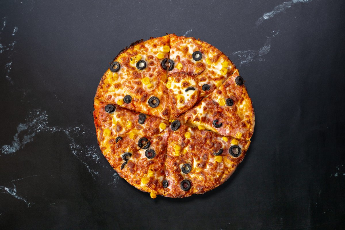 доматен сос, шпеков салам, кашкавал, маслини, млечна царевица 24см