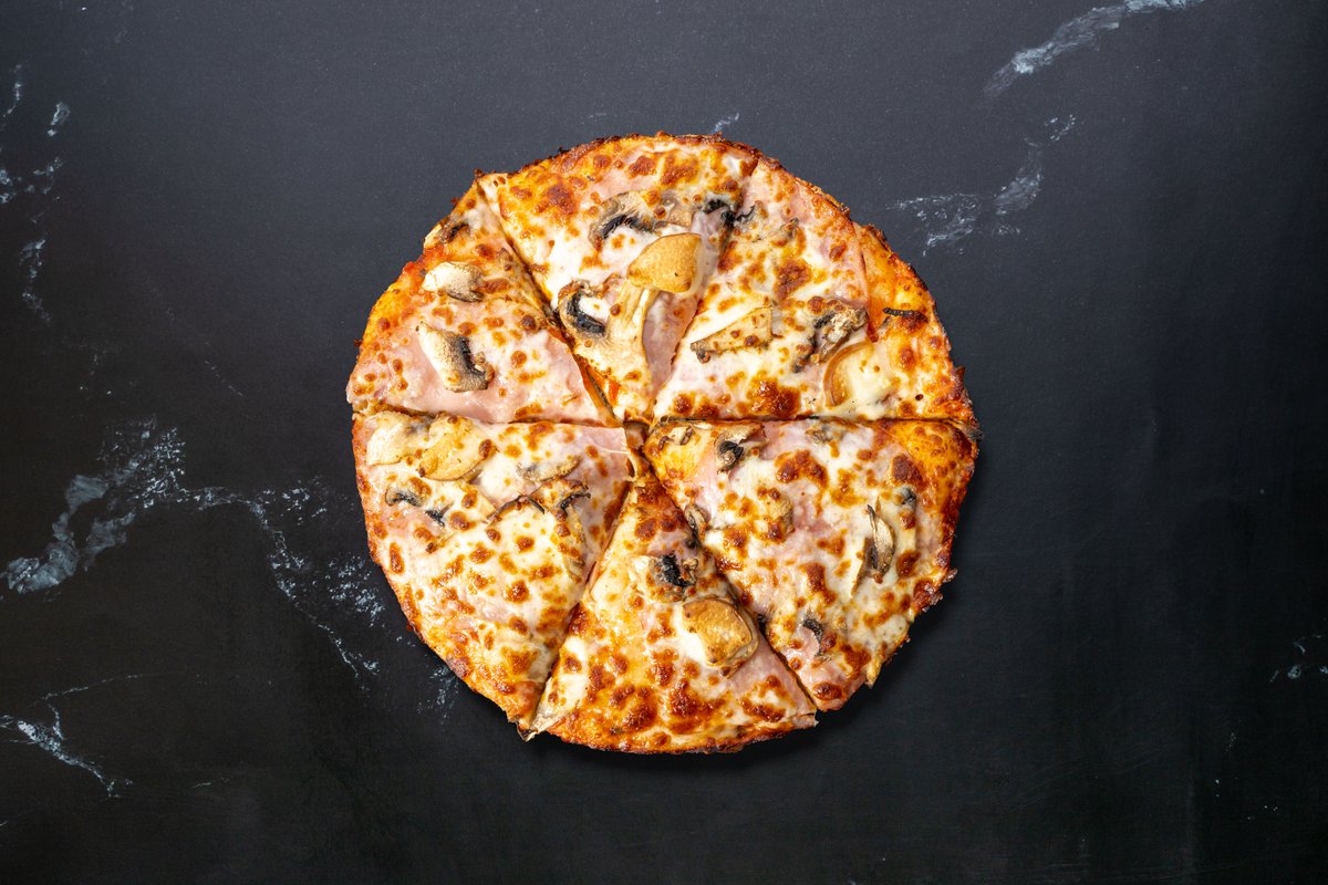 доматен сос, пилешко филе, пресни гъби, кашкавал, млечна царевица топено сирене 40см