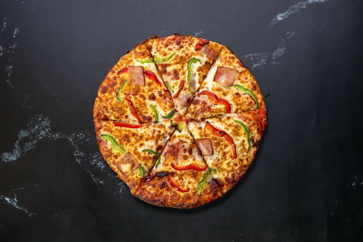 доматен сос, шунка, кашкавал, бекон, яйце, пресен пипер 24см