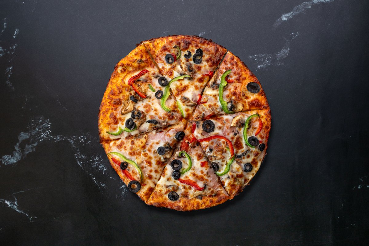 доматен сос, шунка, гъби, кашкавал, пресен пипер, маслини 24см