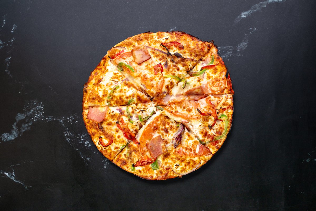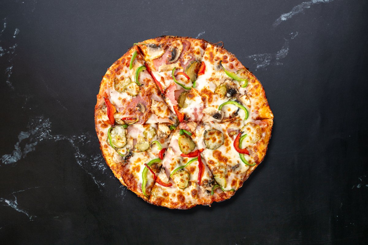 доматен сос, шунка, шпек, гъби, кашкавал, пресен пипер, кисели краставички 24см