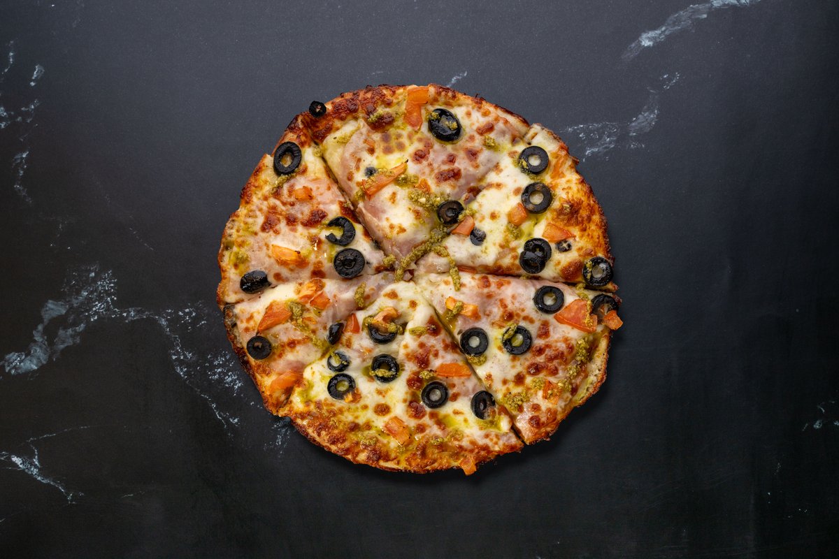 зехтин, шунка, кашкавал, домати, моцарела, маслини, песто сос 24см