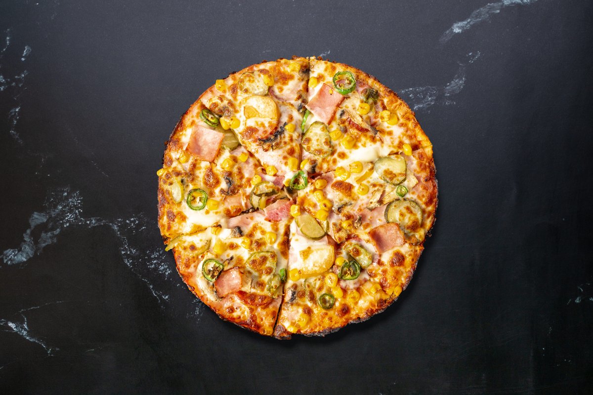 доматен сос, шунка, луканкова наденица, гъби, кашкавал бекон, топено сирене, кисели краставички, млечна царевица, люти чушки 24см