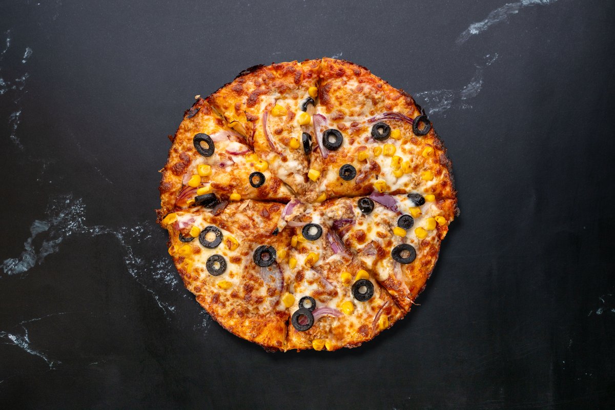 доматен сос, филе от риба тон, кашкавал, маслини, млечна царевица, червен лук, зехтин 24см