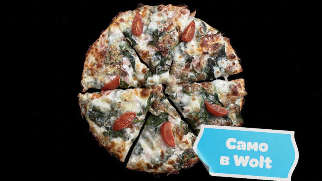 Само в Wolt - сметана , пилешка шунка , спанак , кашкавал,филетирани бадеми , синьо сирене ,моцарела , чери домати , 24см