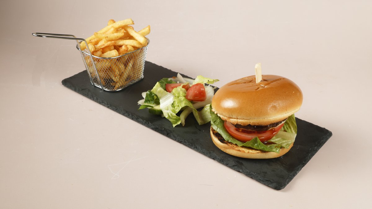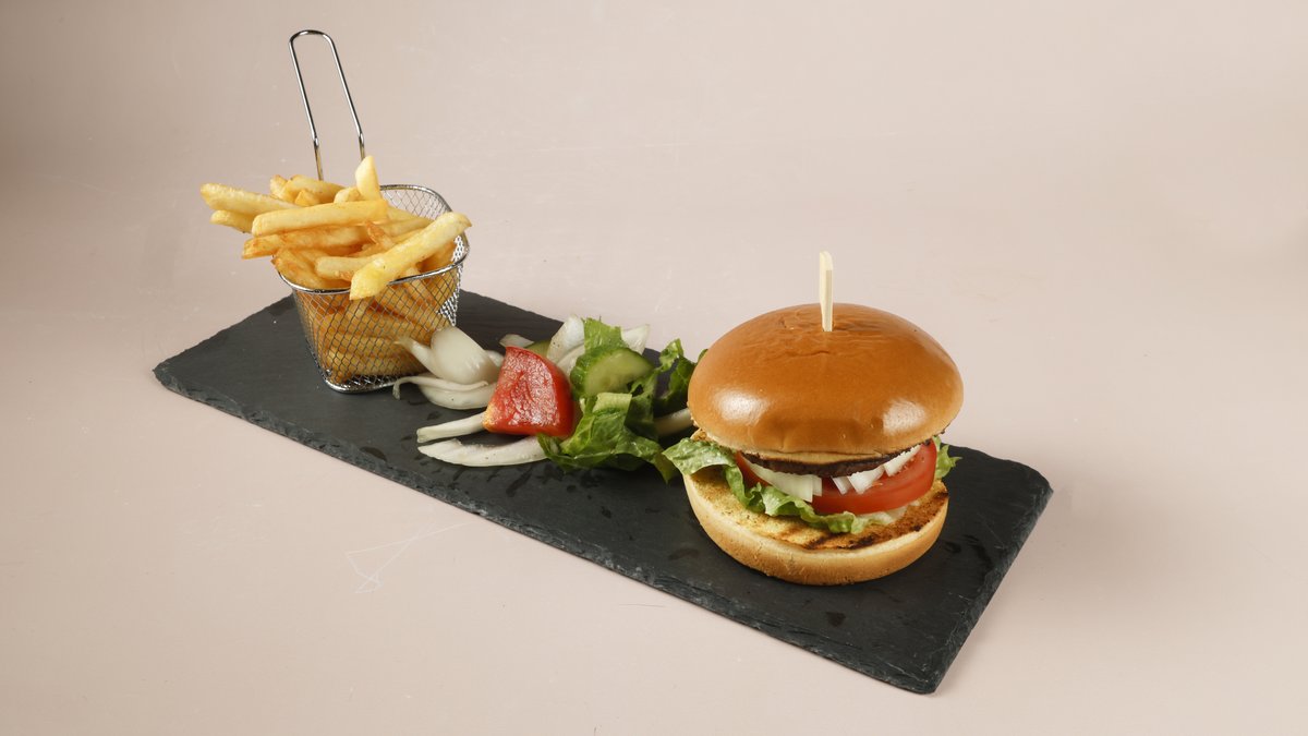 Beef burger with lettuce, fresh tomato andonion, served with chips