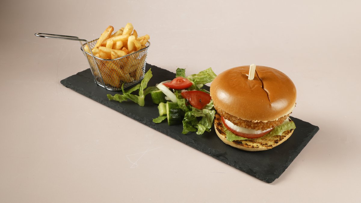 Chicken burger with whiskey sauce, lettuce, fresh tomato andonion, served with chips & side salad