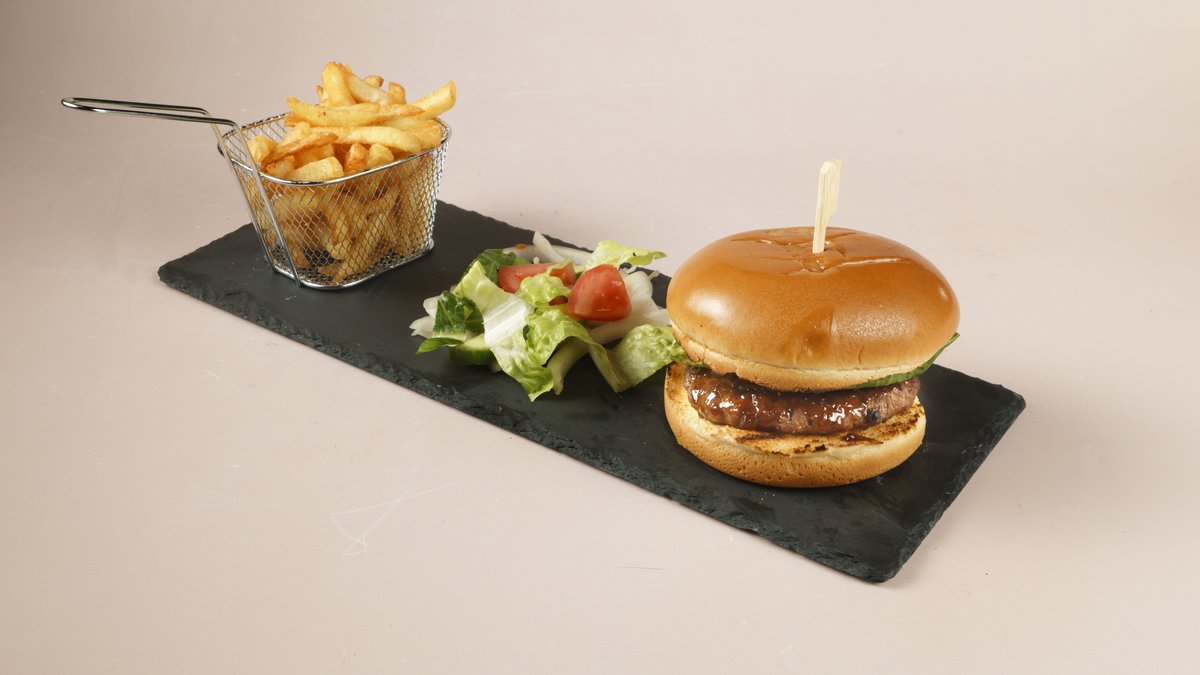 Beef burger with whiskey sauce, lettuce, fresh tomato and onion, served with chips and side salad