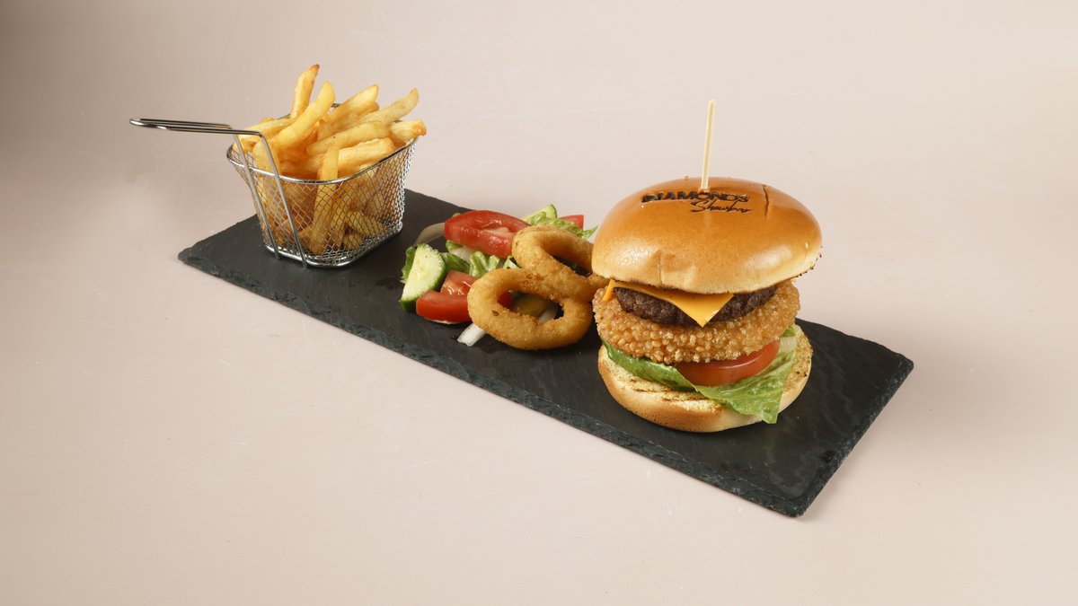 Beef burger, chicken burger with cheese, signature burger sauce, lettuce, fresh tomato andonion, served with chips, onion ring & side salad