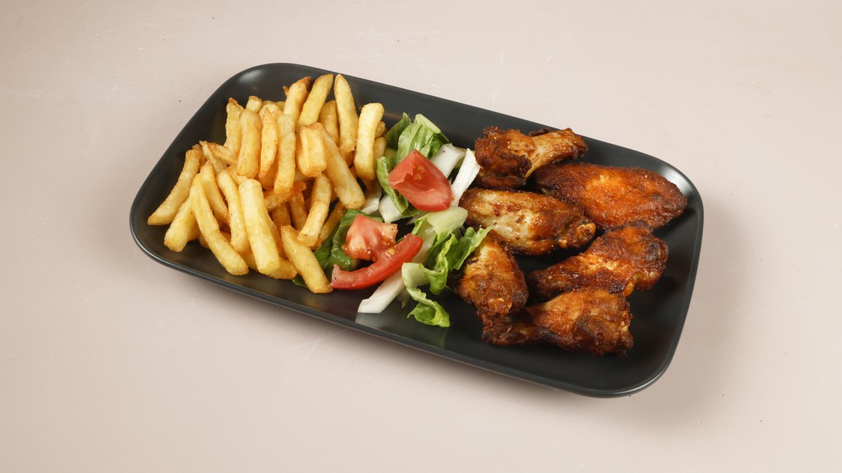 Tex Mex BBQ Wings, Hot n Spicy Chicken Wings, Chicken Goujons, Chicken Mini Fillets, Spring Rolls, Onion Rings, Mozarella Sticks & a portion of Fries.