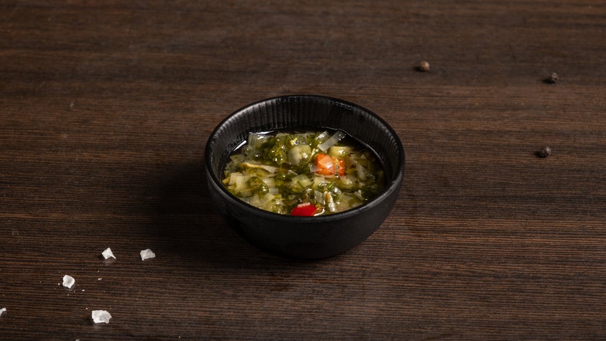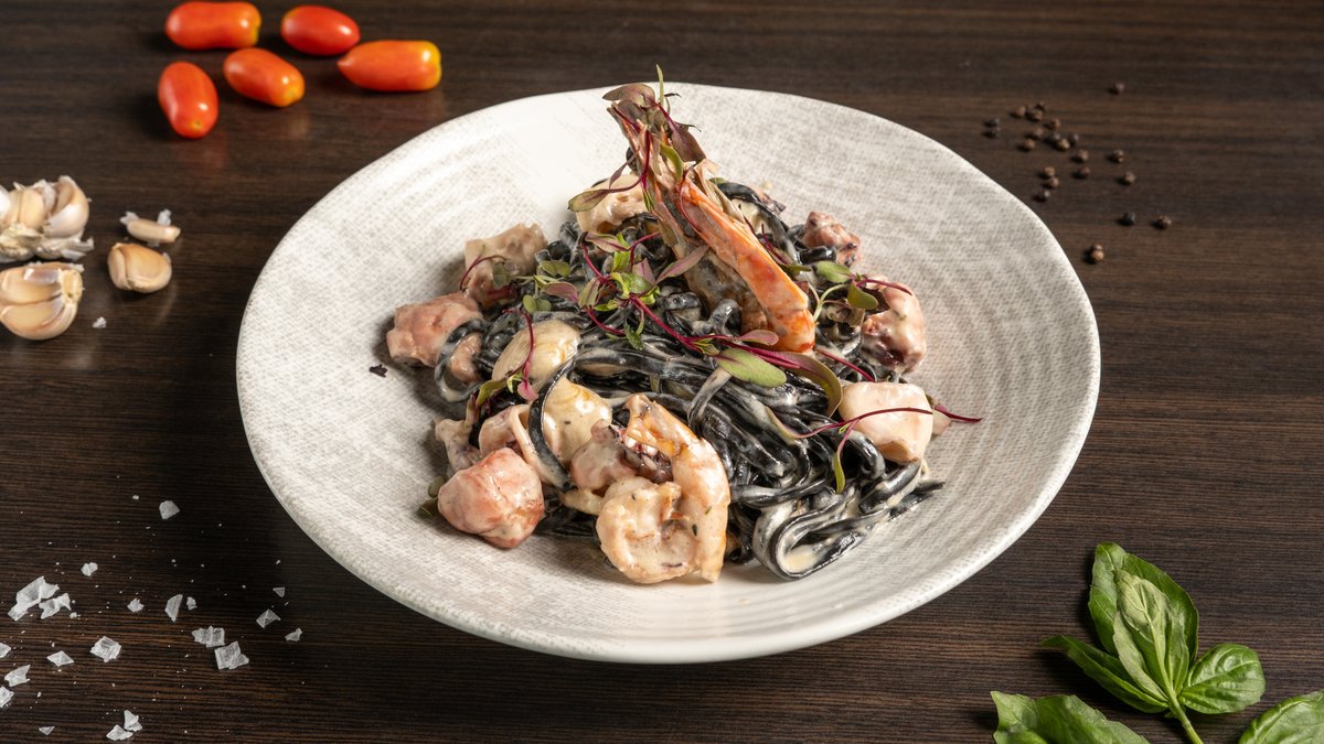 Squid ink with fresh calamari, celery, carrots and pernod mist