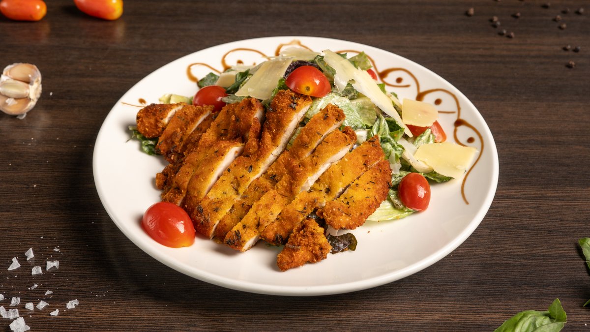 Crispy lettuces, golden breaded chicken, cherry tomatoes, parmesan flakes & classic Caesar vinaigrette.