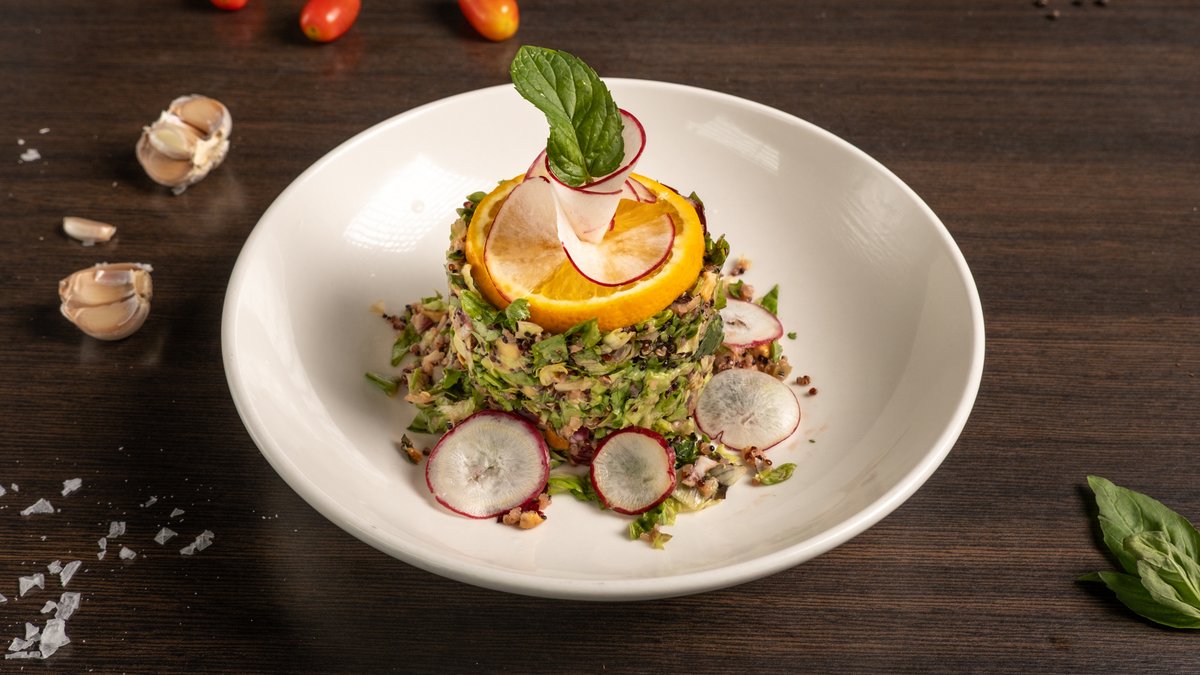 Crispy lettuce leaves with quinoa, beetroot, avocado, radish, cashew nuts, mint, coriander leaves and orange lime vinaigrette.
