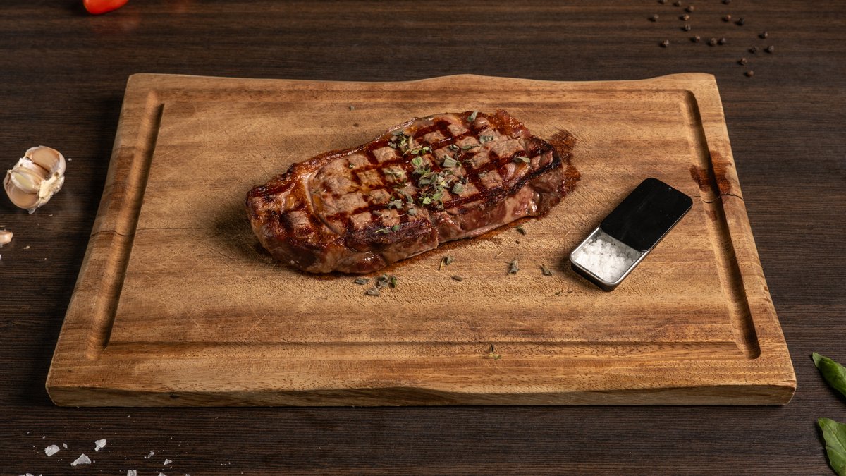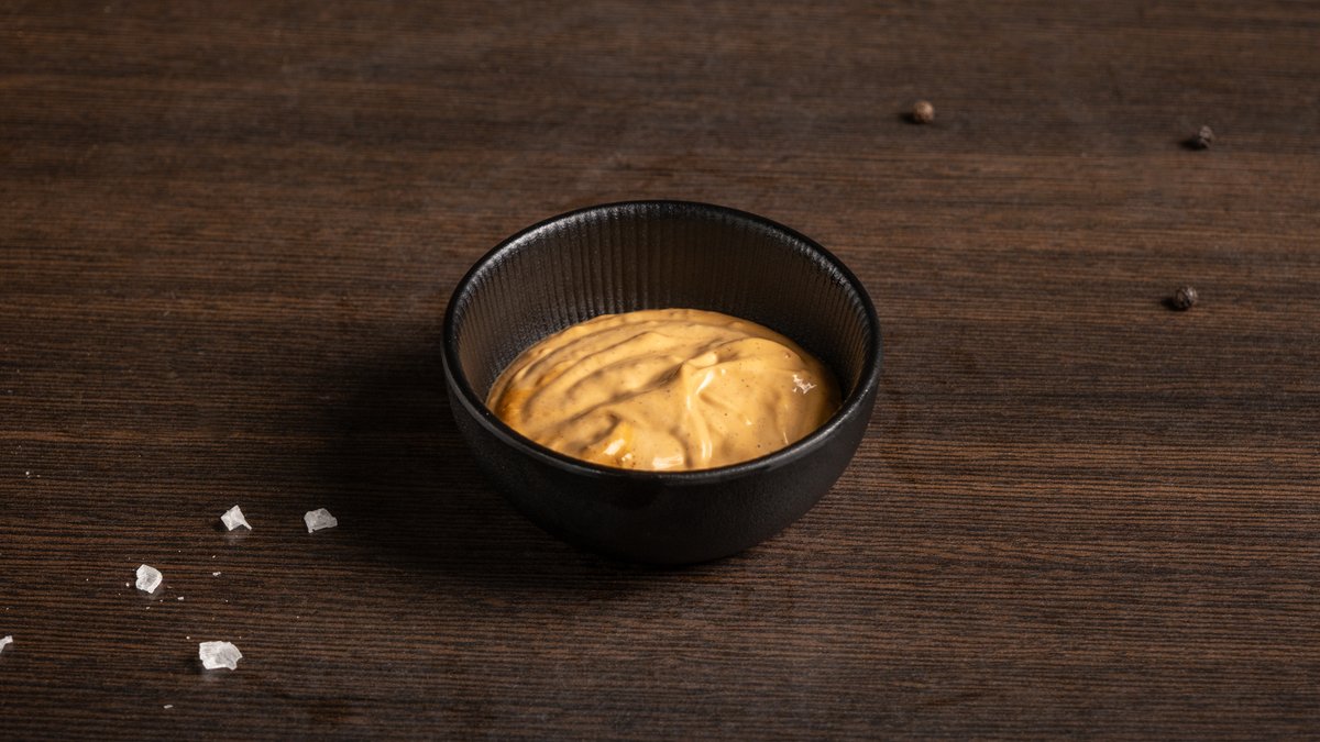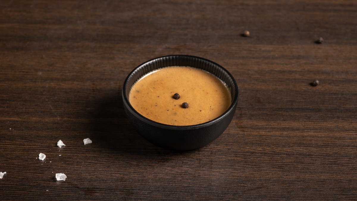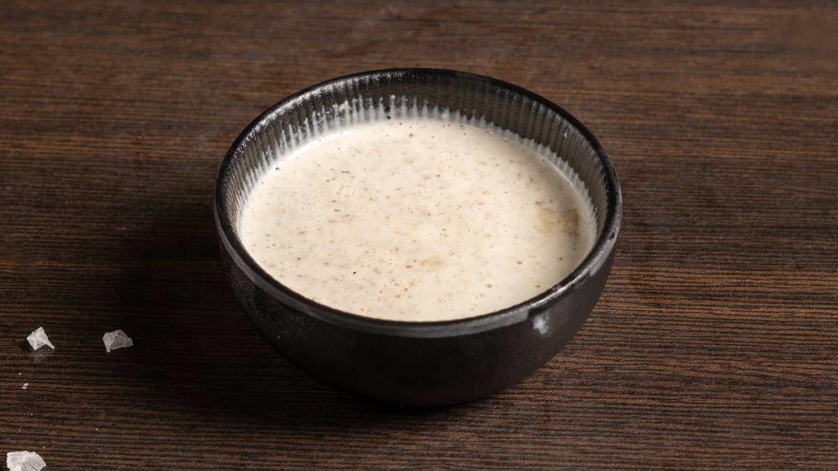 Beef carpaccio with micro herbs, parmesan flakes, truffle mayo dots & truffle oil.