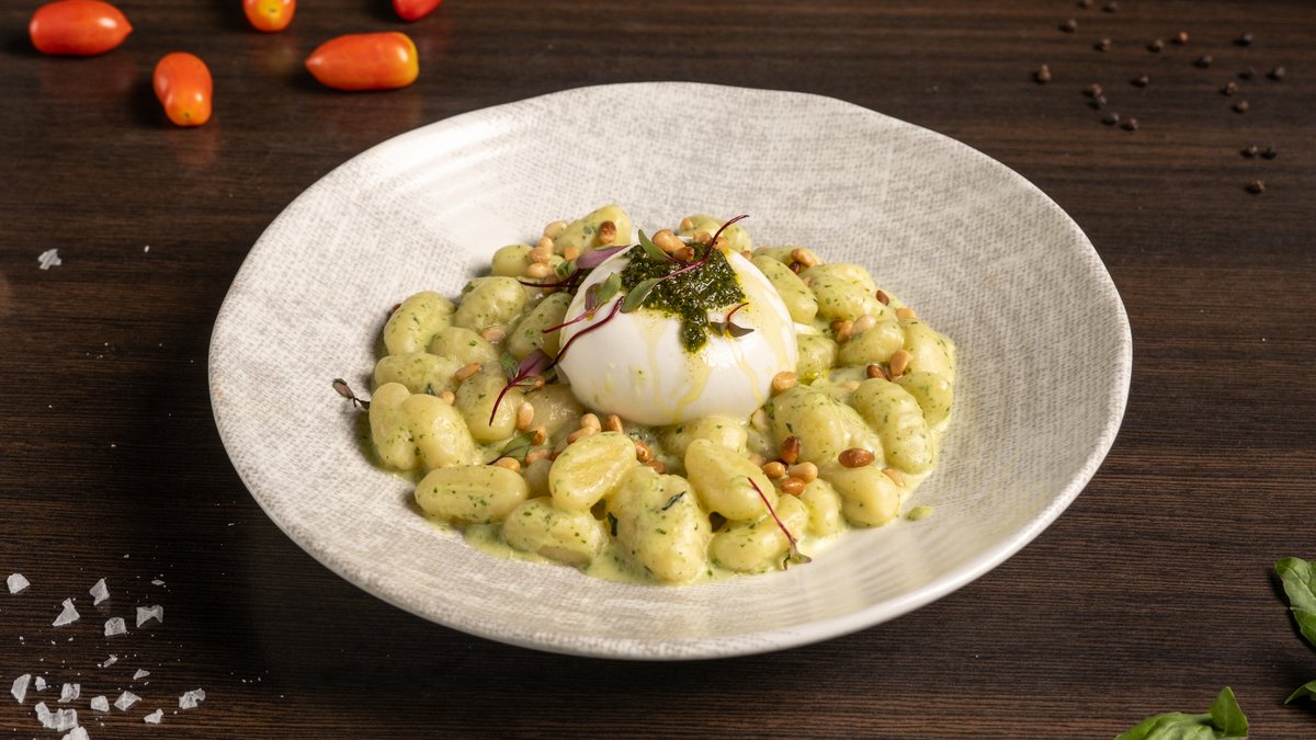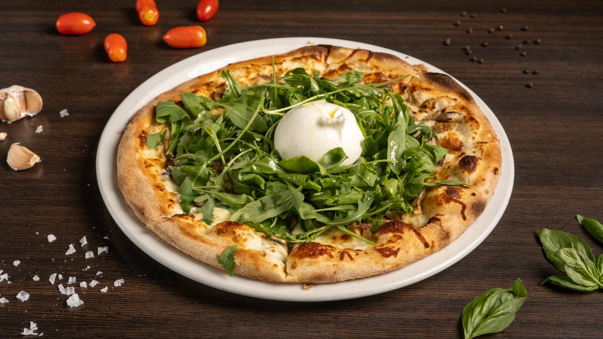 Burrata cheese with cherry tomatoes, rocket leaves, aromatic fresh basil & olive oil and a touch of pesto.