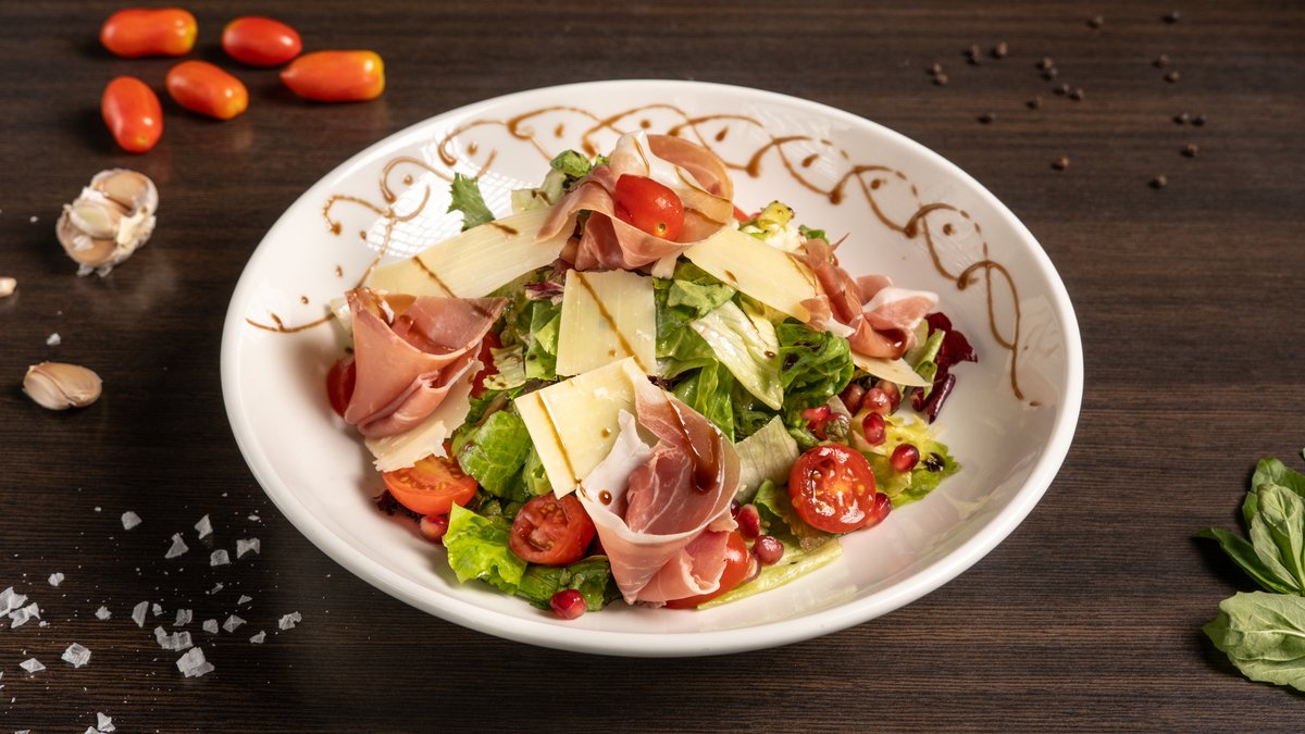 Mixed green leaves with prosciutto, cherry tomatoes, pomegranate, parmesan flakes and balsamic vinaigrette